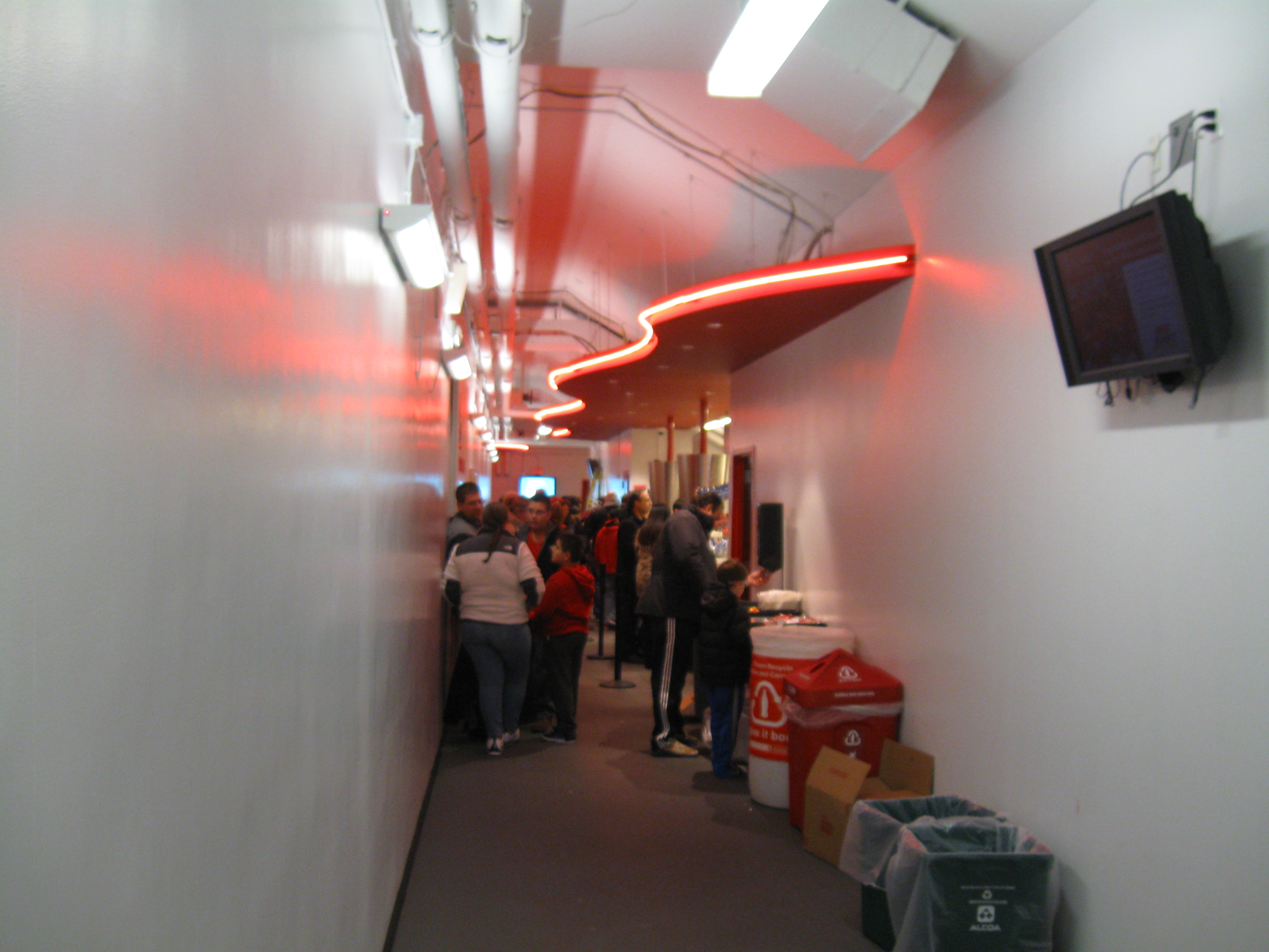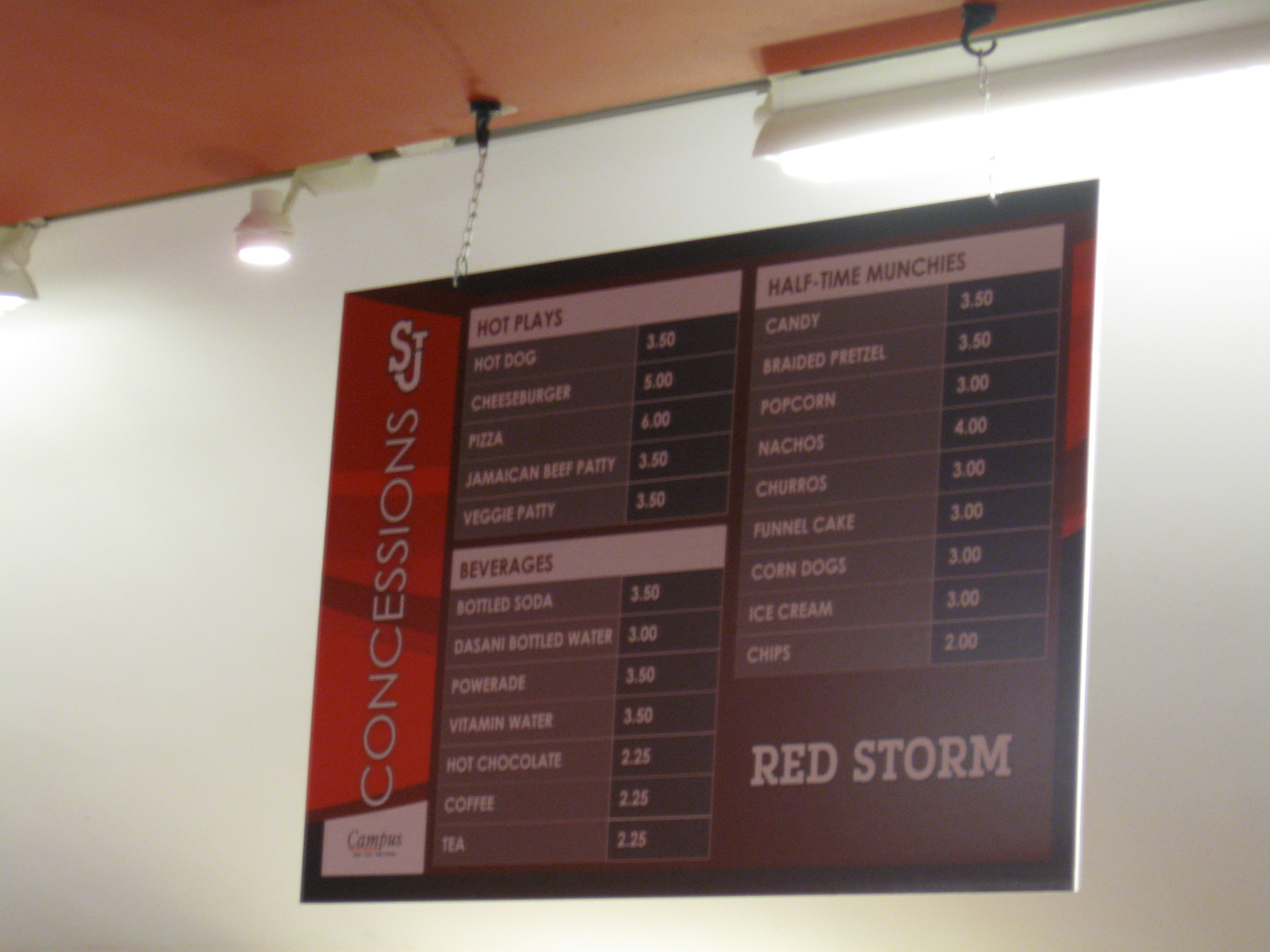 I don’t understand how St. John’s thinks their entrance configuration works well. Instead of having tickets scanned immediately after passing thru a security screening and metal detectors, the scanners are on the side entrances to the arena. While the initial foyer is well decorated and it is a nice, newly created space, the ticket-takers’ position makes it awkward for fans wanting to return to this area during the game. Anyway, a hallway on each side leads right into a corner of the gym. There is another concourse on the other side, but this is much more like a tiny hallway and lines quickly bottle up for the lone primary concession stand. Another thing pointing to the limited space of the arena: only 2 bathrooms for each gender were available and these were not exactly spacious.