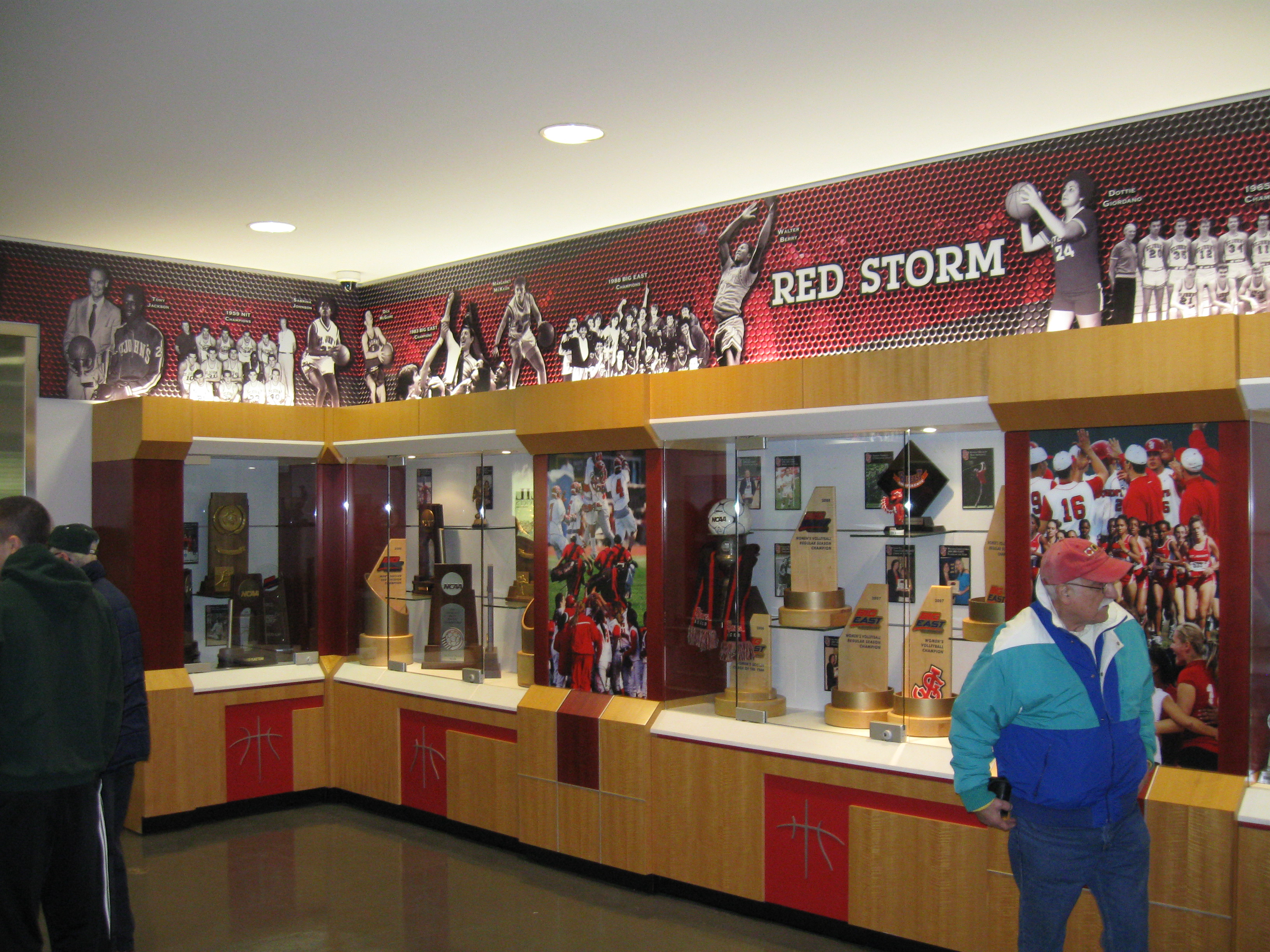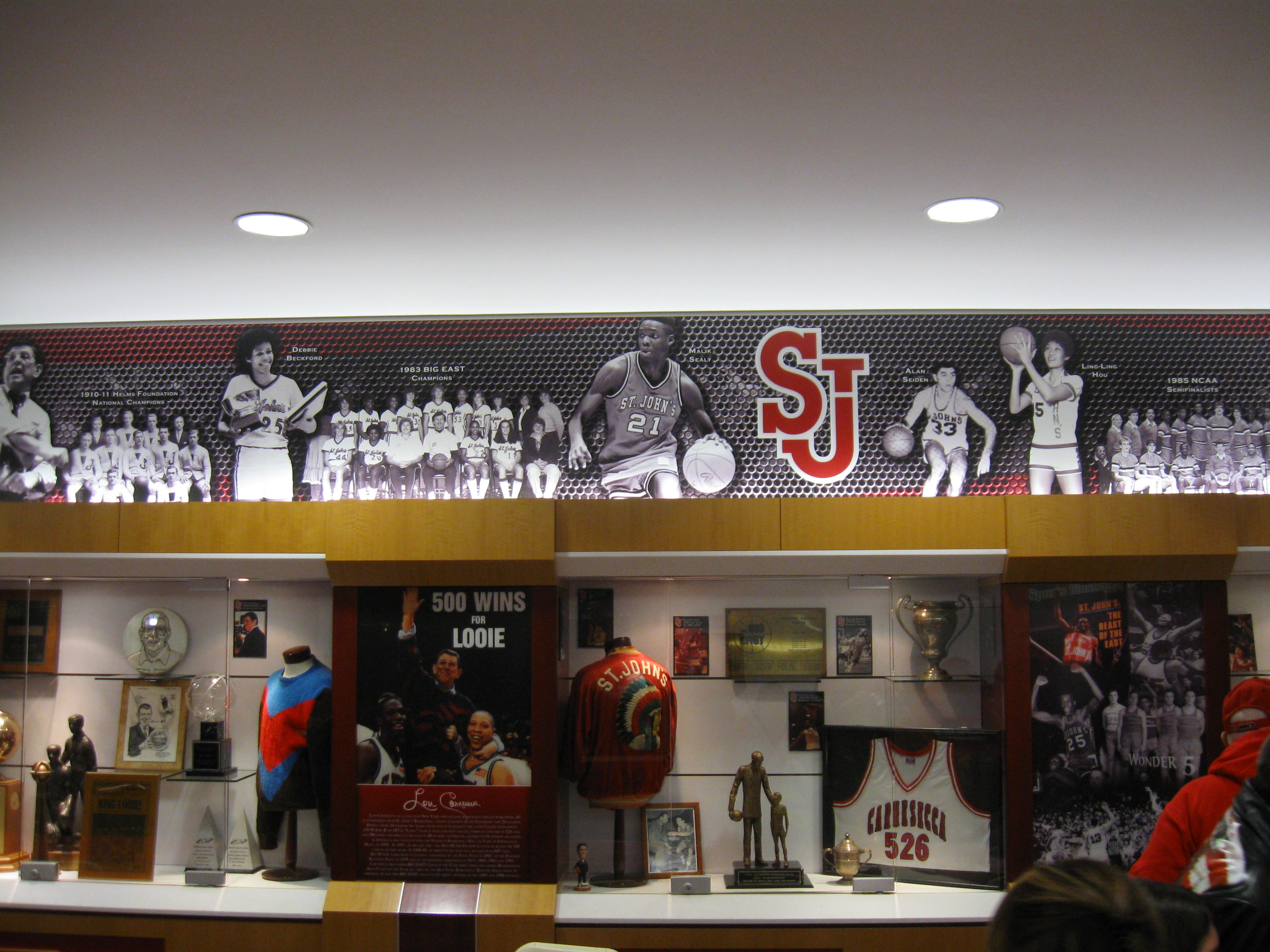 The displays section is fully visible to fans as they walk in with the back wall of the lobby complete with a whole range of things to look at. On one side are all the basketball honors. Various cases include a wide range of memorabilia and this includes sections reserved solely for Lou Carnesecca (and one of them has a famed sweater of his!). The other side shows off the remaining Red Storm athletic accomplishments as Big East and National trophies can be found for different sports. I also loved the wallpapering mural at the top. Inside the arena, banners hang on each end wall. At one end are simple white banners reserved for championships and NCAA appearances for basketball and volleyball. The other end features individual honors as there are 10 red “legacy” banners for players and coaches.
