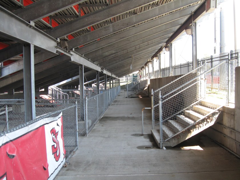 I counted 276 people in the stands during the third inning, while the official box score didn’t take the time to count, instead guessing nearly triple that. Fans were a mixed group and it was good to see many students on hand. The only show of support was when a run was scored as about half of the crowd took the effort to applaud. Most noise came from the dugout and the families of players sitting behind that dugout. When the Red Storm put a run on the board, Ace Frehley’s catchy “New York Groove” would play over the speakers. One note, in the 2007 game that Jack Kaiser was honored with a renaming of the stadium, less than a thousand were on hand.