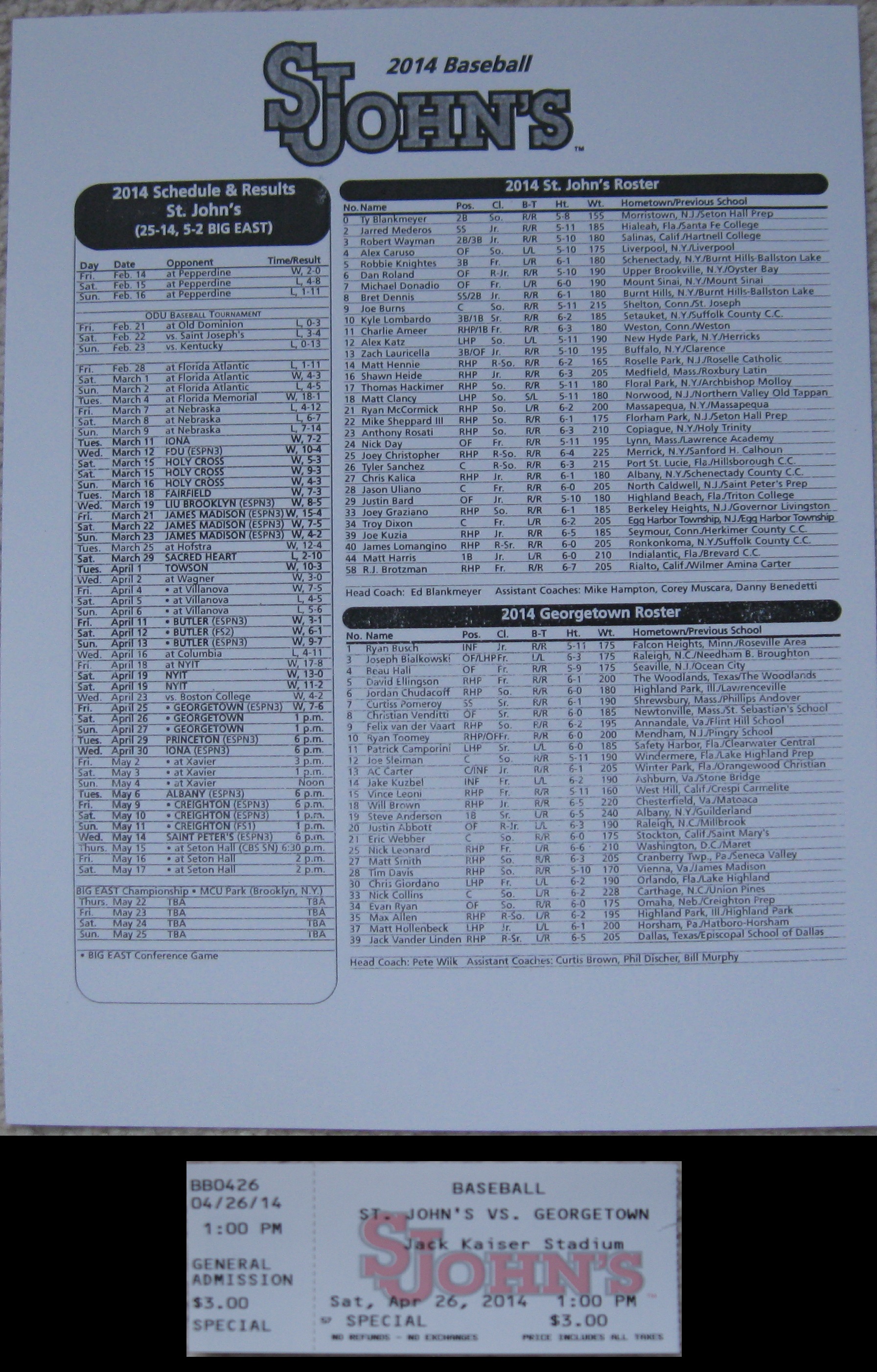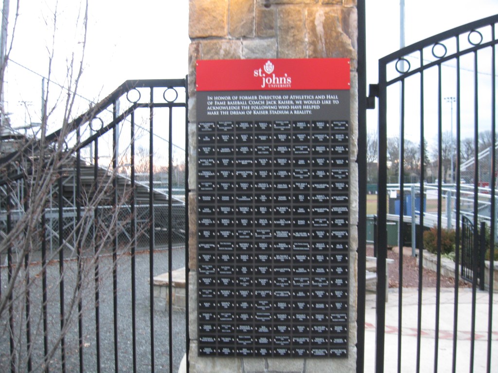On the Saturday that I went to the game, there was a Health and Wellness Festival on the lawn next to the stadium. I was thankful for the tents of free stuff as it was my only source for food. The campus event also provided some interesting background sound for the game, as a mix of rap music, DJ interjections and health presentations mixed with the game….In the first year of the stadium, the facility was known as “Ballpark at St. John’s” and it was used by a Single-A team making its local debut. The new team was known as the Queens Kings and St. John’s was a temporary stop on the way to being affiliated with the Mets. A year later, they moved to a new ballpark in Brooklyn and changed the nickname to “Cyclones”…..In 2007, the stadium name changed to honor Jack Kaiser, an athlete, coach and long-time Athletic Director at the school…..St. John’s for decades was known as the “Redmen”, however that nickname was dropped in 1995 as it was considered discriminatory.
