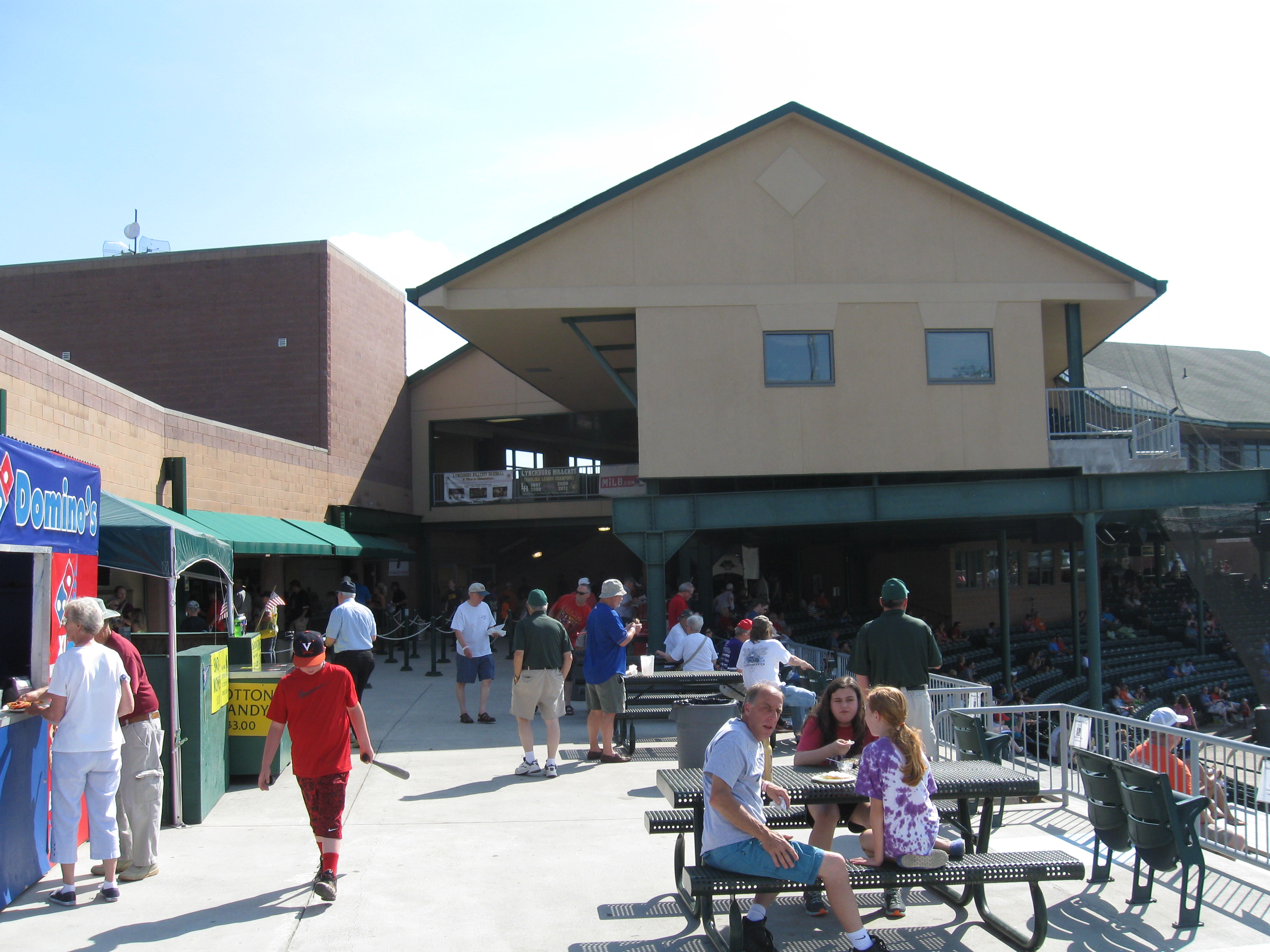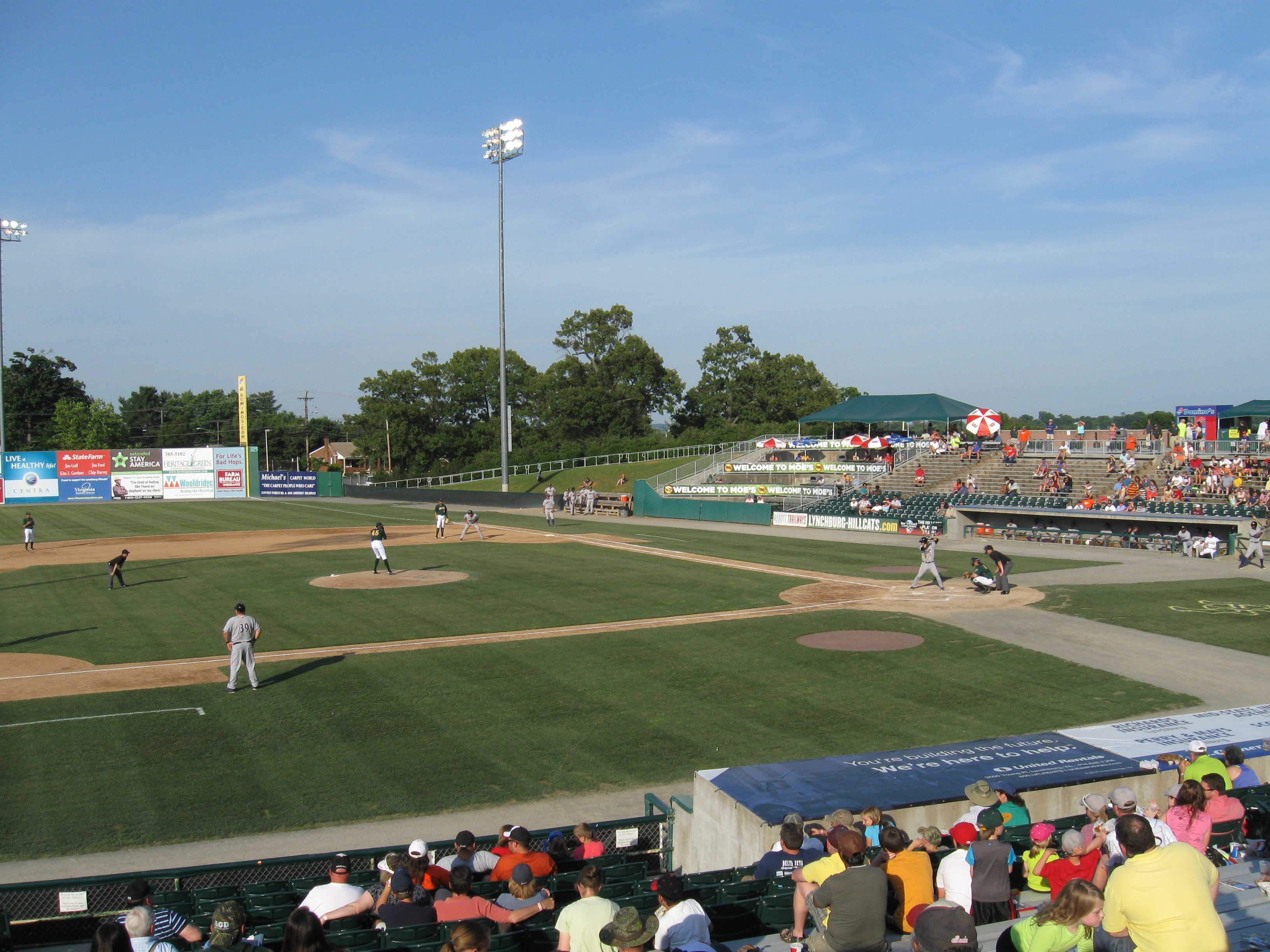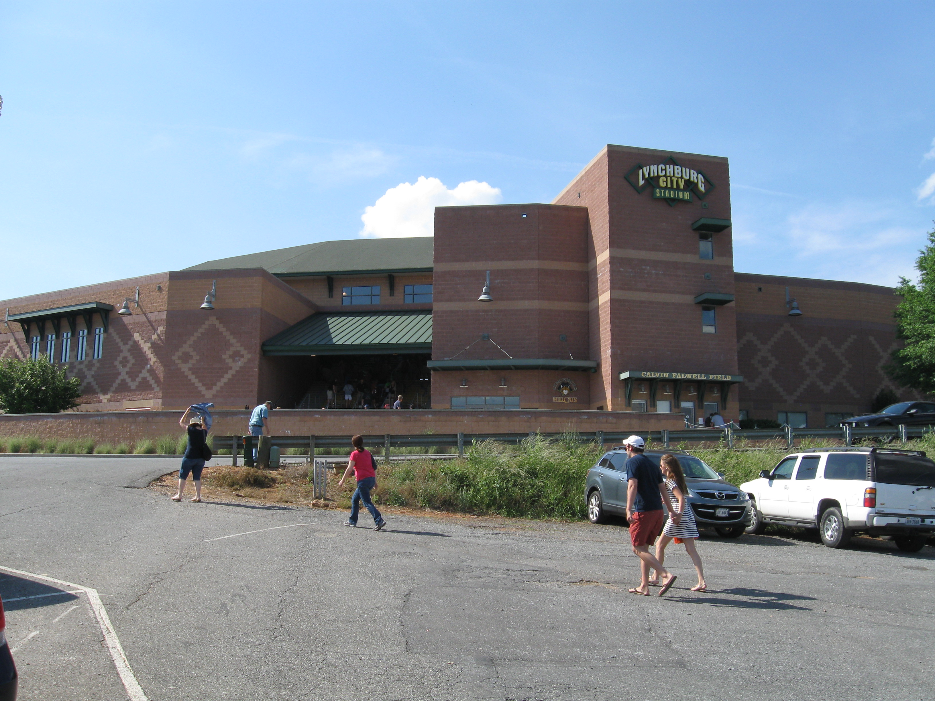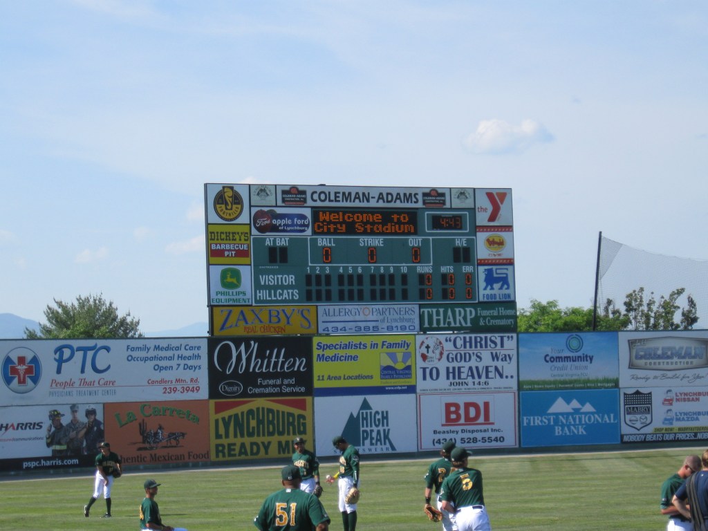 Returning from a weekend in West Virginia, we crossed over the Blue Ridge Mountains into the central part of Virginia, where the city of Lynchburg is located. Named after founder John Lynch, the City of Seven Hills has a population of 75,000 and is the fifth largest metro area in the state. The Hill City moniker is quite apparent even in downtown, which steeply goes uphill from the James River. The baseball team has been a rock in the city as Lynchburg has played in the Carolina League since 1966. After taking on nicknames of their many major league affiliates, the team became the “Hillcats” in the mid 90s and the nickname has even survived their current affiliation with Atlanta, a franchise that always forced the Braves name on farm teams. Lynchburg has won seven league titles, including a pair of recent championships (2009 and 2012). City Stadium has been their long time home field and a relatively recent renovation modernized the park and renamed it to Calvin Falwell Field (though it is still widely referred as City Stadium). The ballpark was built in 1940 and sorely needed changes recently transformed this stadium into one more commonly seen now in the minor-league baseball world. Judging by old pictures, it looks like the nostalgia factor was lacking and I’m content with the renovation.