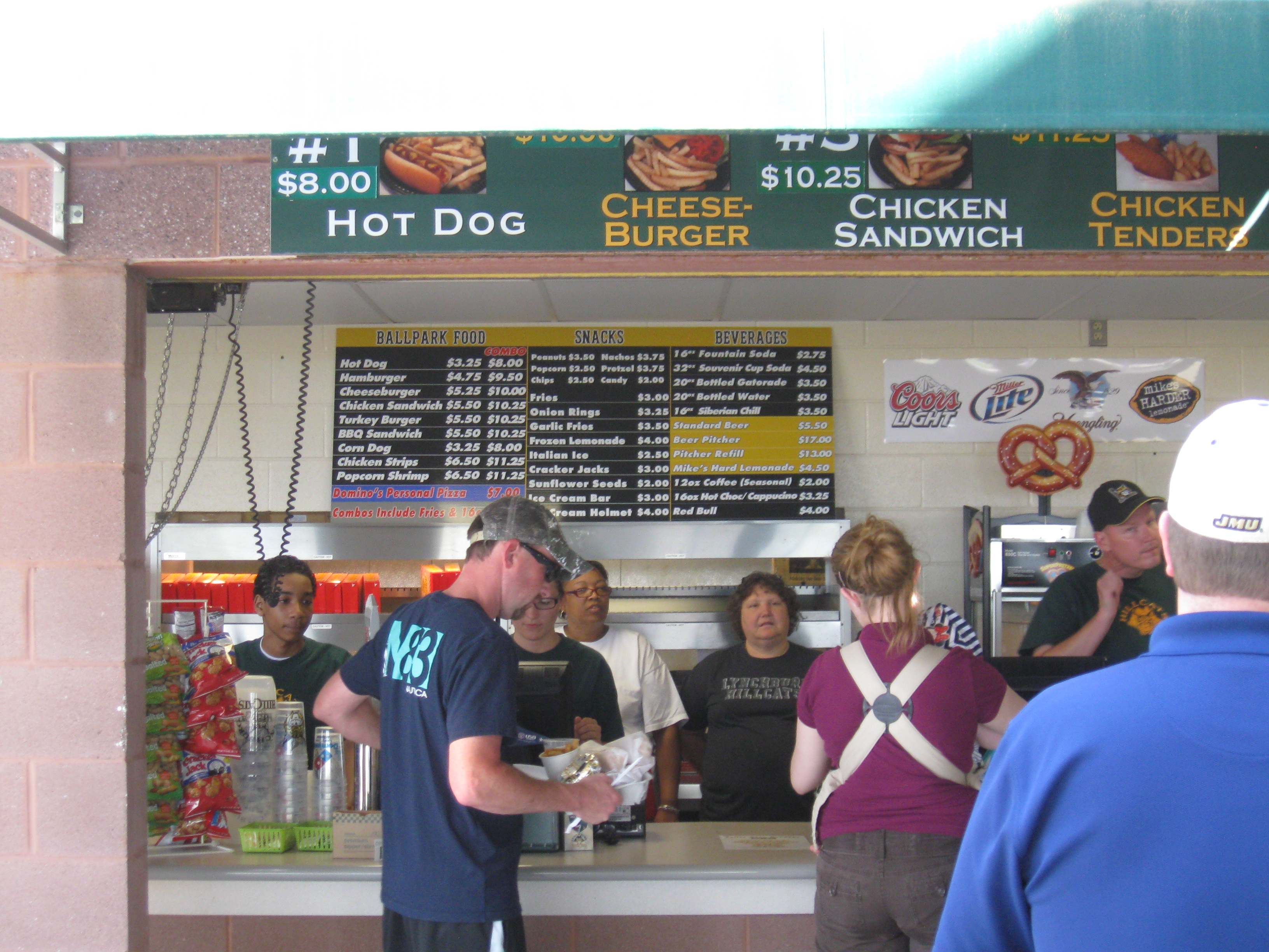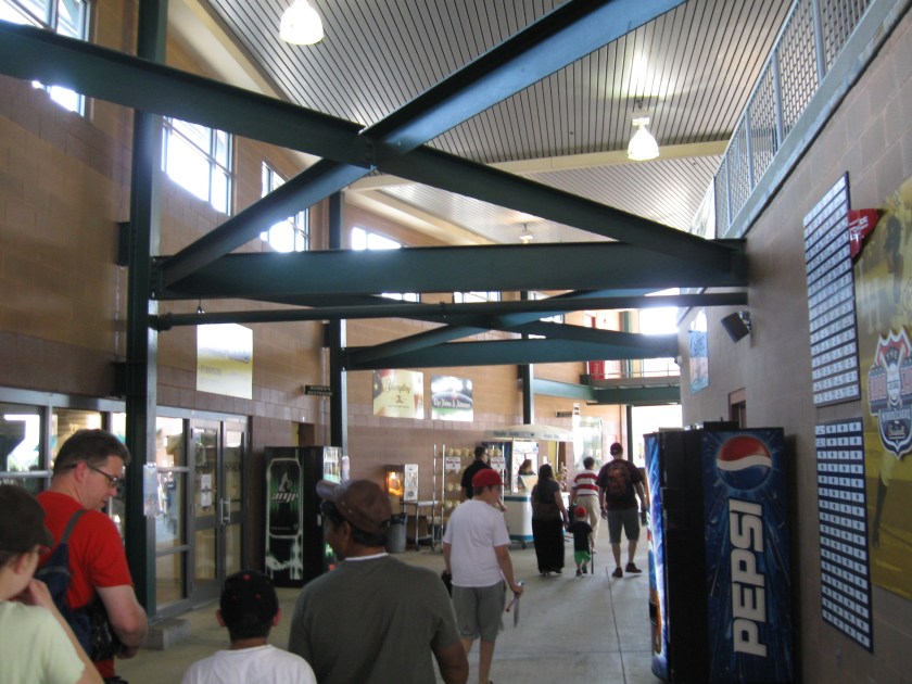 Two primary concession stands offer the same food, which are the classics. The snacks and sweets were pretty standard as well. Popcorn Shrimp and Turkey Burgers were a little different, while Domino’s supplied the pizza. Overall, nothing all that enticing. The “Hot at the Plate” stand, which looked to offer more pizzazz for food, was not open nor did it look ready to open. A popular item was the $17 pitchers of beer and a refill was $13.