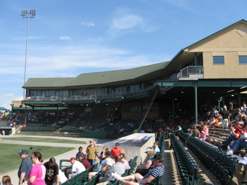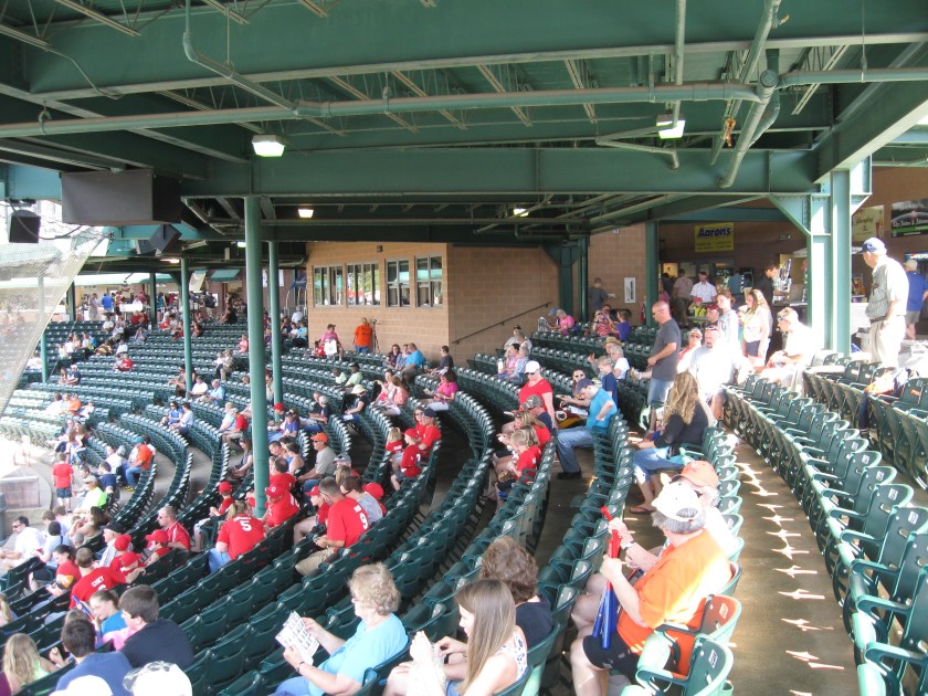 Eleven sections of seating around the infield make up the stadium built into a hill, making a natural amphitheater for baseball. A large overhang covers much of the seating bowl, a bonus on the sunny and warm 5 PM start for the game I attended. This overhang contains many skyboxes, while the press box is almost part of the seats at the back of home plate. Wide, green seats are used about two-thirds of the way through and as bleachers are used beyond that, certainly a downgrade. Ticketing is confusing for first-time visitors as most say “General Admission”. The only reserved seats are near the dugouts, so some (me) may not realize that they can actually sit in the individual chairbacks throughout Sections 4-8. The seats themselves are ok, however the bowl is set further from the field as there is a lot of foul territory. Combine that with periodic support beams and the view isn’t the best. Annoying double-decker ads make up the outfield wall, while off in the distance, one can vaguely sees the hills and mountains of the region. Too bad that the ballpark could not take advantage of Lynchburg’s terrain and provide a much better elevated view. The spire of the West Lynchburg Baptist Church can be seen if you are in the right seat.