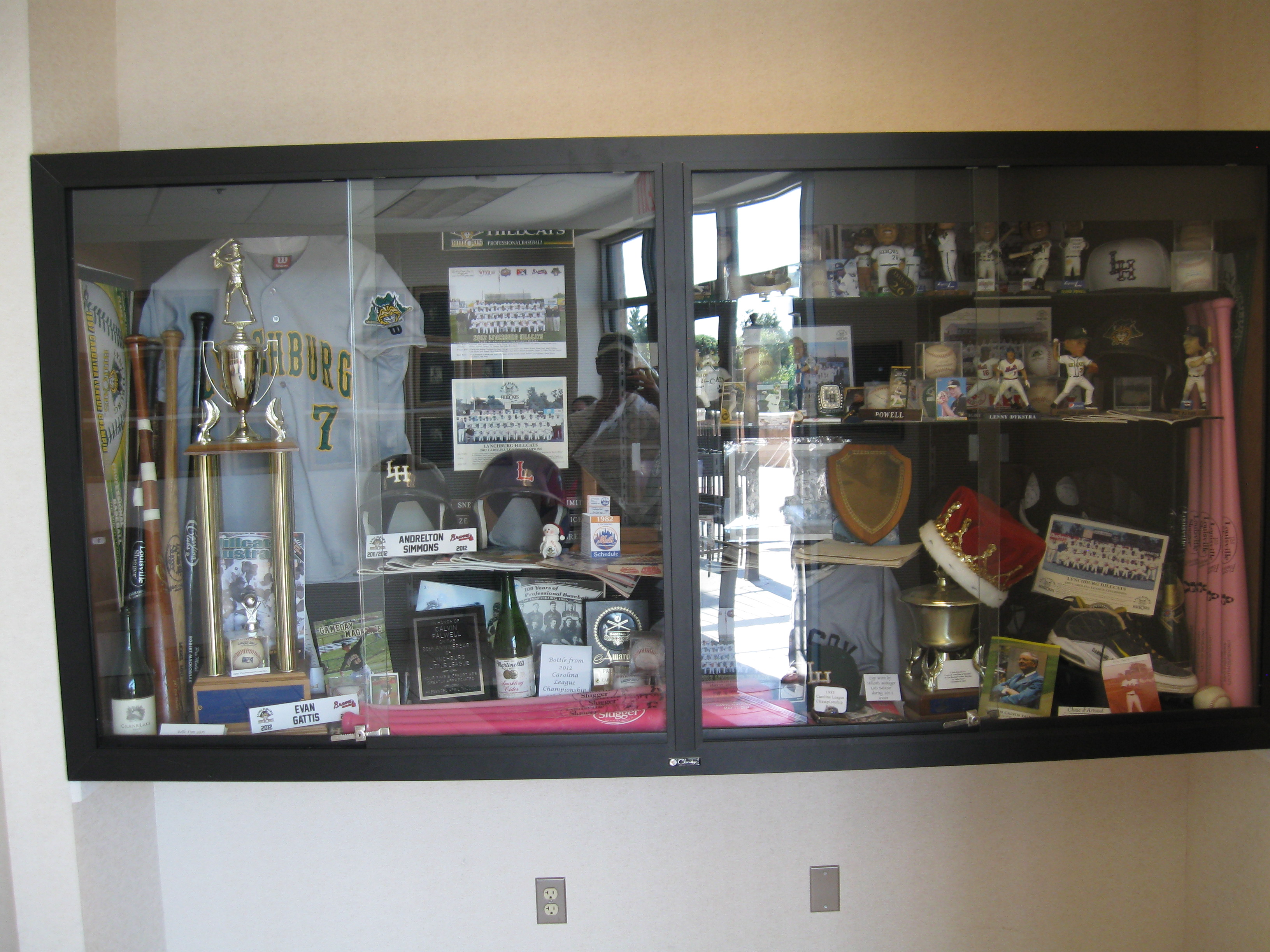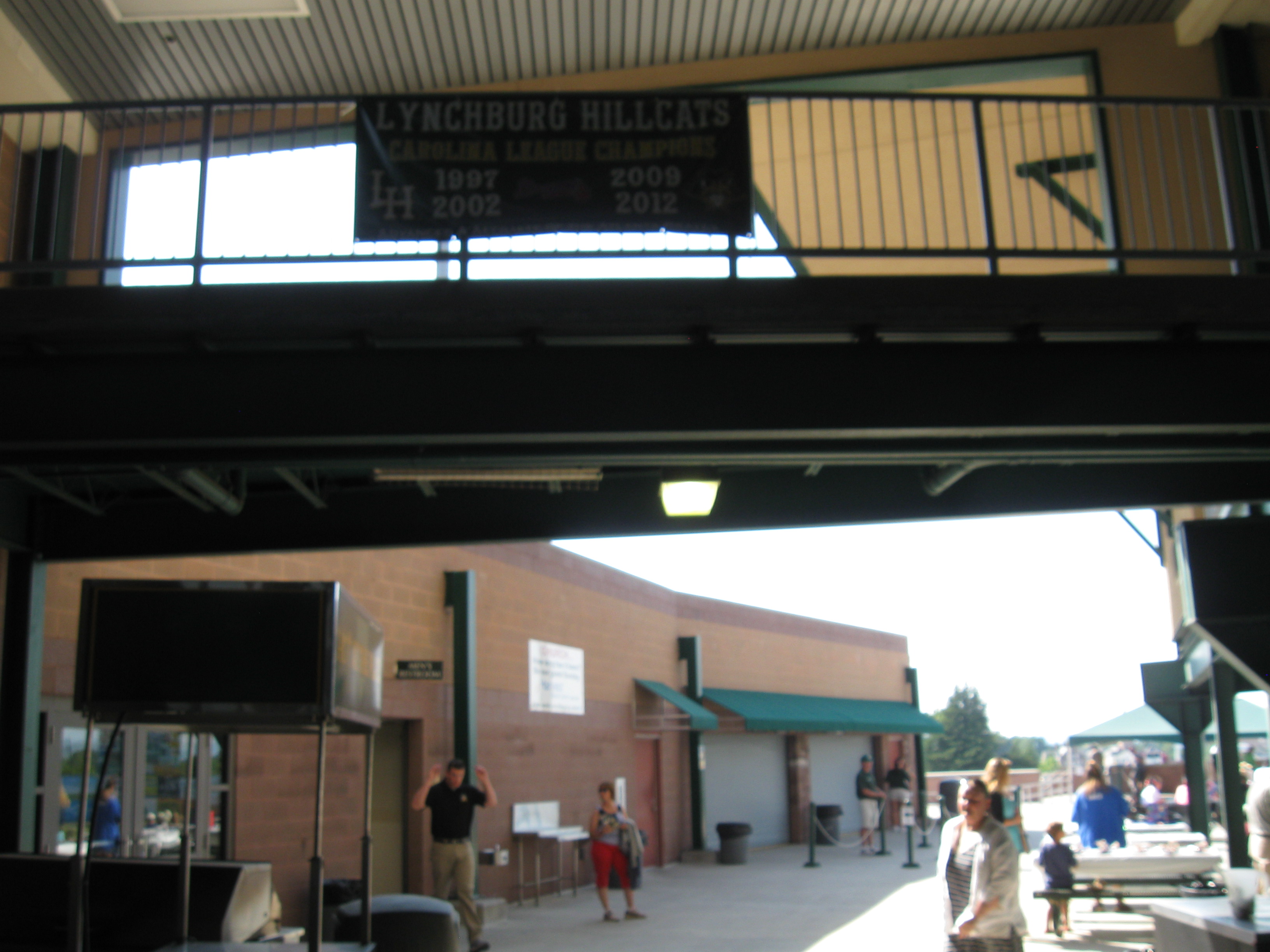 Somewhat hidden by appearing as a suite entrance, the area leading to team offices features walls decorated with history. Lynchburg Sports Hall of Fame members take up much of the space, while a glass display off to the side features quite the mish-mash of collectables and memorabilia. Unfortunately, this area is only accessed from outside the ballpark. Also on the exterior, are three dedication plaques on the walls near the box office. Lynchburg’s Carolina League championships are displayed with a small banner at each end of the concourse. Curiously, only their recent four titles (out of seven total) are noted. There is also a “Road to the Show” display in the concourse with pros that started as a Hillcat. Lynchburg has one retired number and on the outfield wall is a “Bibby 26”, which is for Jim Bibby, who was a longtime pitching coach and former major leaguer.