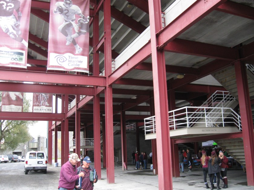 Getting to Hamilton can be a chore as it is 30-45 minutes from Interstates 90 and 81. Several different two-lane county roads are needed to arrive into town. The sports facilities are down College Street and football parking is essentially created as the only small paved lot is reserved for Maroon Council members. General parking is behind the stadium, further down the road and all on grass. Weather can come in to play (especially since this is Central NY) and any heavy rains or accumulating snow leads to other campus lots needing to be utilized. The crowd for the game I saw was small, thus getting in and out of Colgate was not a problem.