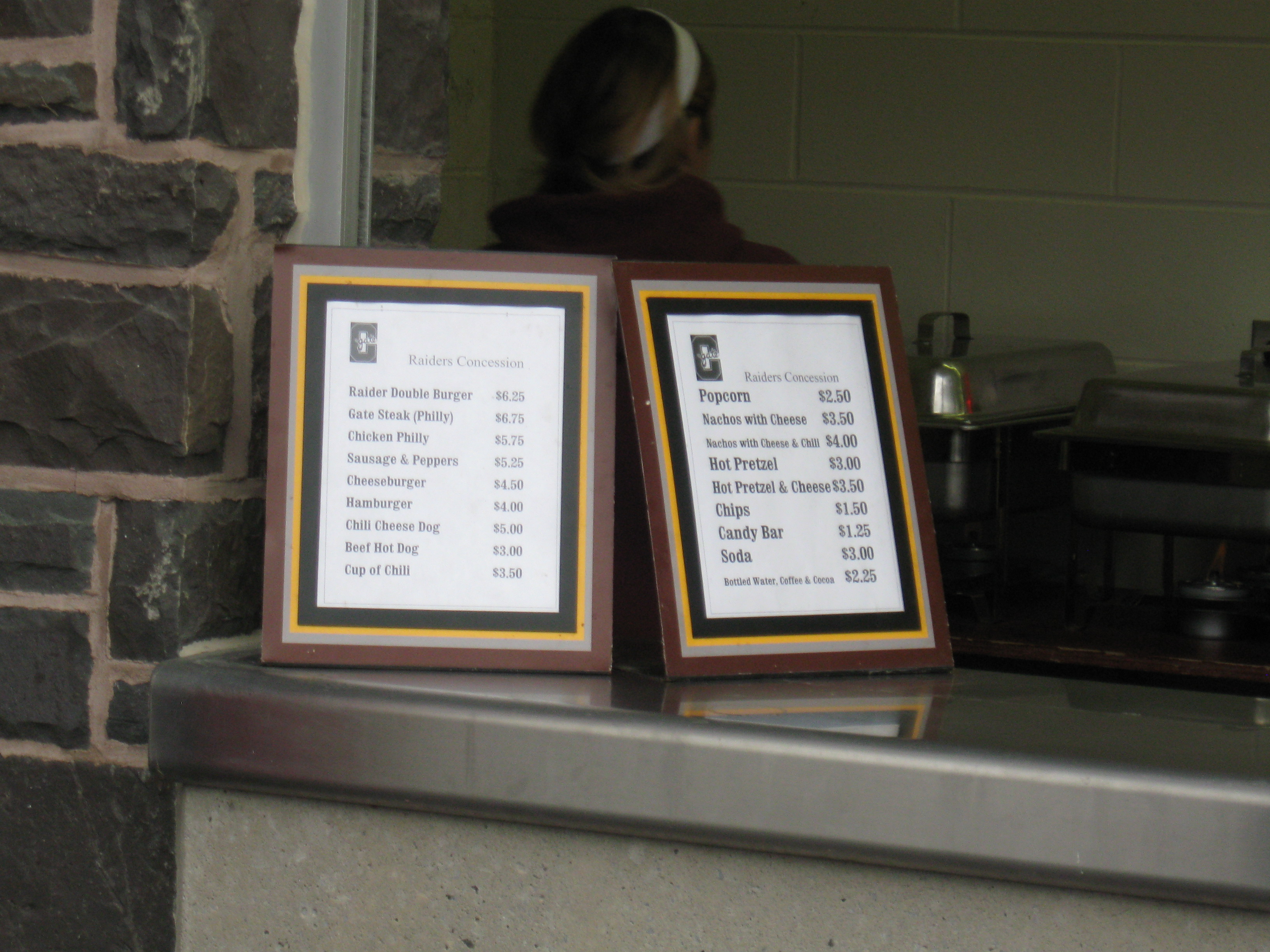 The food offerings are the same at each stand and though basic, the options are not bad. Burgers, Sausages, Philly Cheese Steaks and Chicken are featured along with various snacks. Perhaps the best choice for most football games is the cup of chili. Beverages are soda, water, coffee and cocoa.