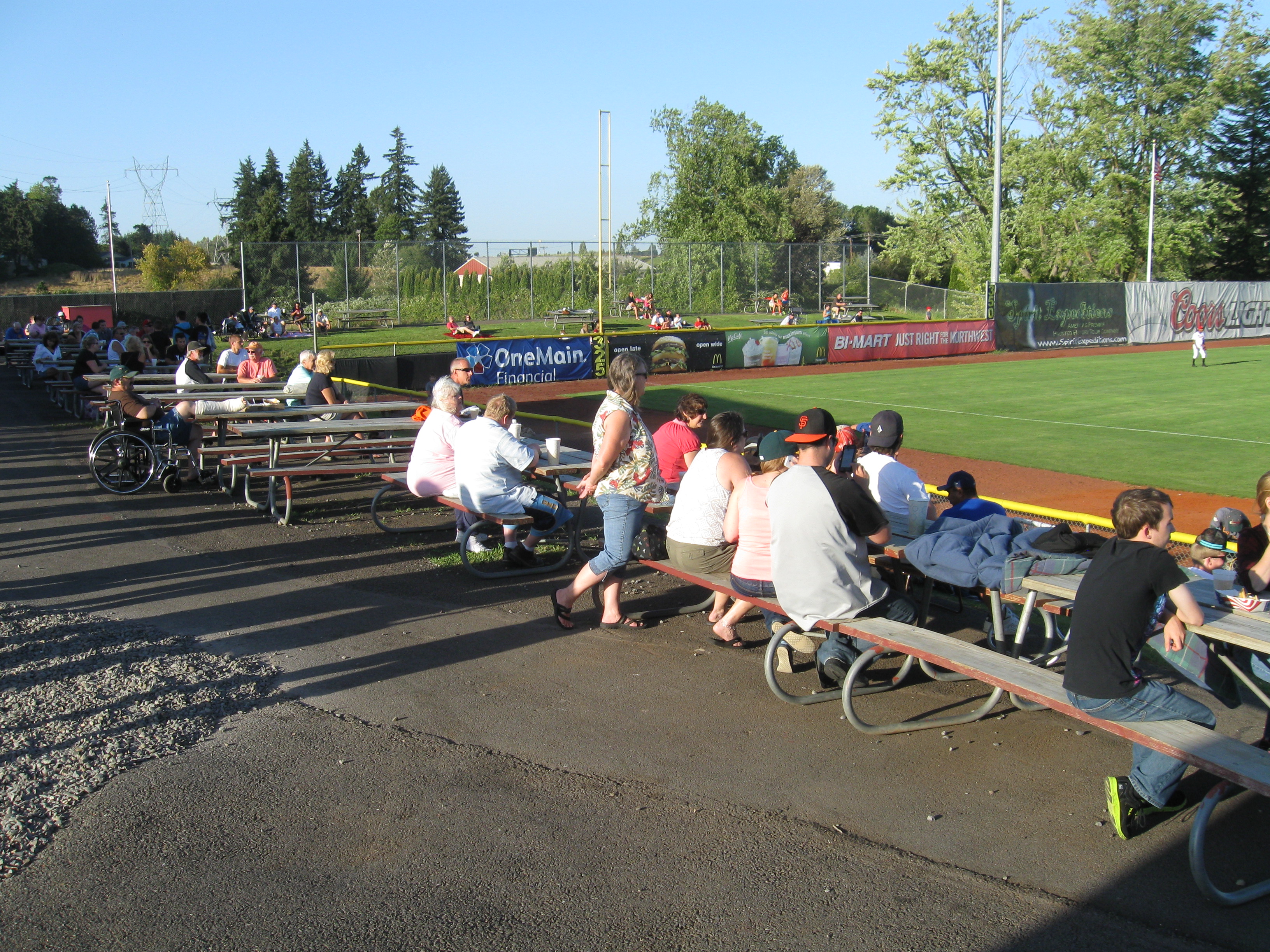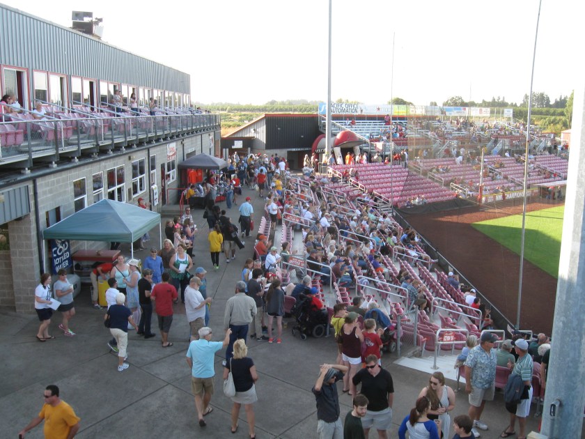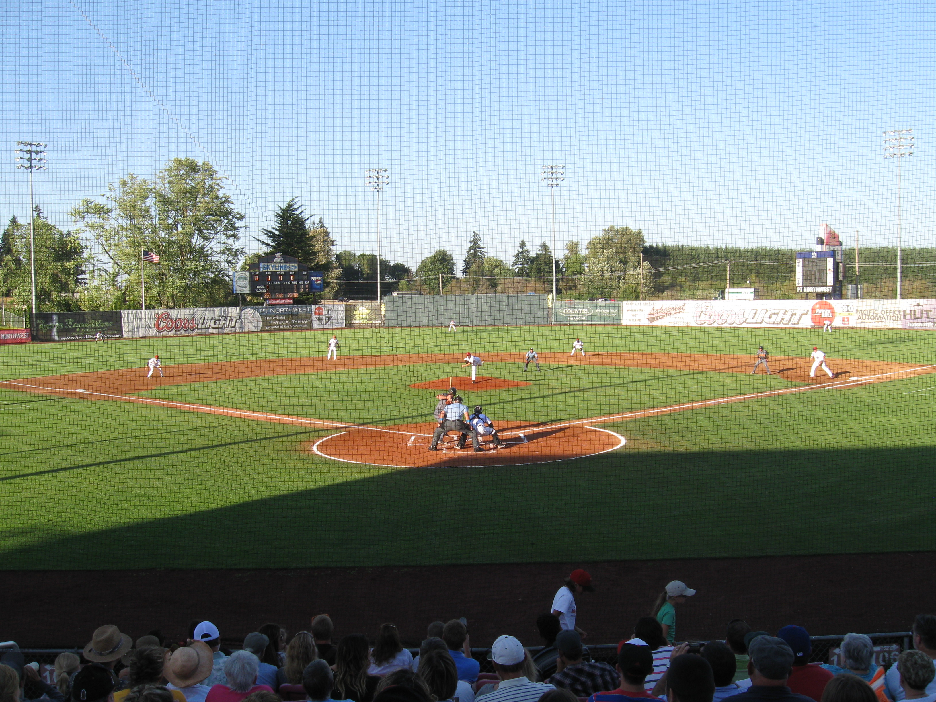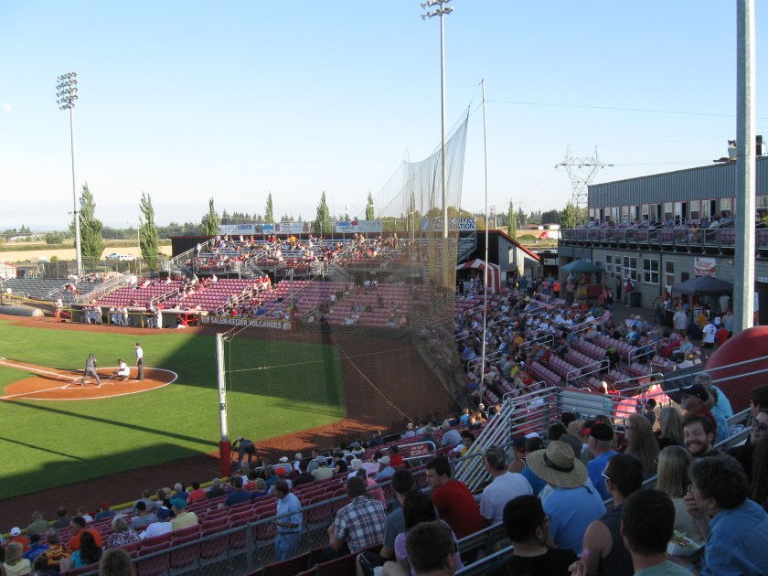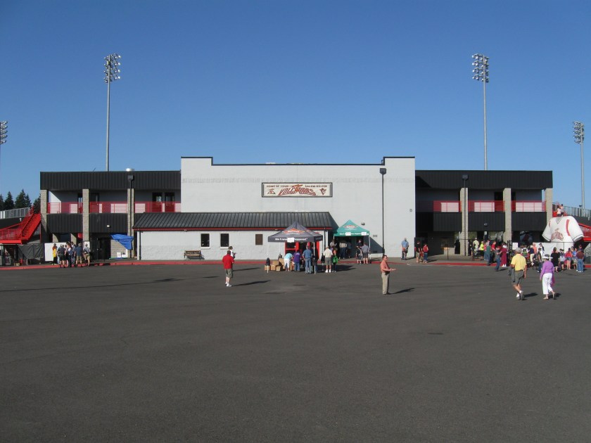After a day of exploring in the state capital of Salem, OR, we headed five miles north for a Northwest League game in Keizer. The duel city name for the team is due to the proximity and relationship between the two cities as the former Salem community of Keizer only became an independent city in 1982. Located in the Willamette Valley of NW Oregon, Keizer (pop: 35,000) really plays the role of suburb with the capital acting as the main city. Salem was a charter franchise in the Northwest League, but with no modern ballpark, baseball left to Yakima in 1990. Seven years later, the region saw the Bellingham franchise move to a new ballpark built in Keizer. As a long-time affiliate of San Francisco, the Volcanoes have been remarkably successful in their short history with five league titles. Unfortunately, Volcanoes Stadium does not match the on-field success. The ballpark fails in several aspects as it looks ten years older than its age and has a strangely horrible design.