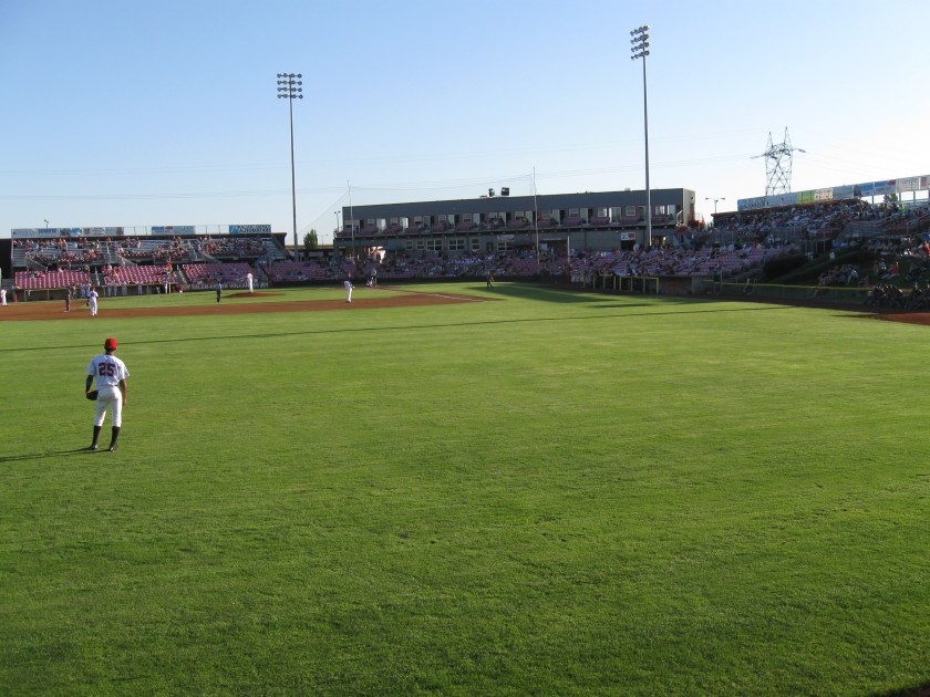 The Volcanoes nickname comes from the nearby Cascade Range, which is full of volcanoes. Too bad that there is not more in the ballpark to play up this theme as there is a lot that can be done. When Salem-Keizer scores, smoke comes out from the small logo on top of the scoreboard…..Though the service was mostly mediocre, the stadium did have several friendly waitresses coming to each section to take orders for fans. I’ve never seen this throughout an entire seating bowl and while the feature can be good, it did get a little annoying having to say “No Thanks” to the waitress every couple innings (in case you’re wondering, I quickly moved from the outfield grass to one of the vast amount of empty seats)…..On a related note, most concessions close after the 7th inning…..Promoted throughout the game is “Roofman”, a guy who comes out to throw random stuff to the crowd from the top of the building that holds the suites/press box…..Volcanoes Stadium is home to Oregon’s state high school baseball championships