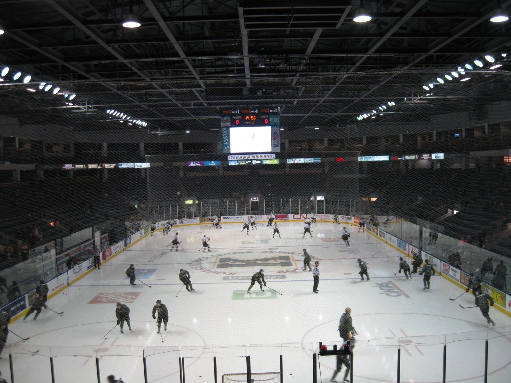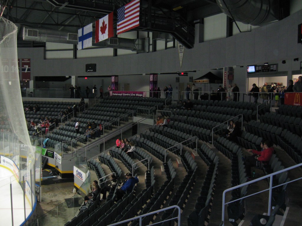 On a Friday Night when the military was honored, there were about 4,000 that came out for the game, thus filling the stands 75% of the way. Interestingly, nearly every suite was occupied. Despite the new arena, attendance figures were surprisingly low during the K-Rock Centre’s first few seasons, but in recent times, the Frontenacs have found themselves closer to the middle of the pack in the attendance standings. During the playoffs last season, the team drew a little better than previous short postseason campaigns and the team almost sold out Game 7. Gear for the Fronts was very isolated thru the crowd.