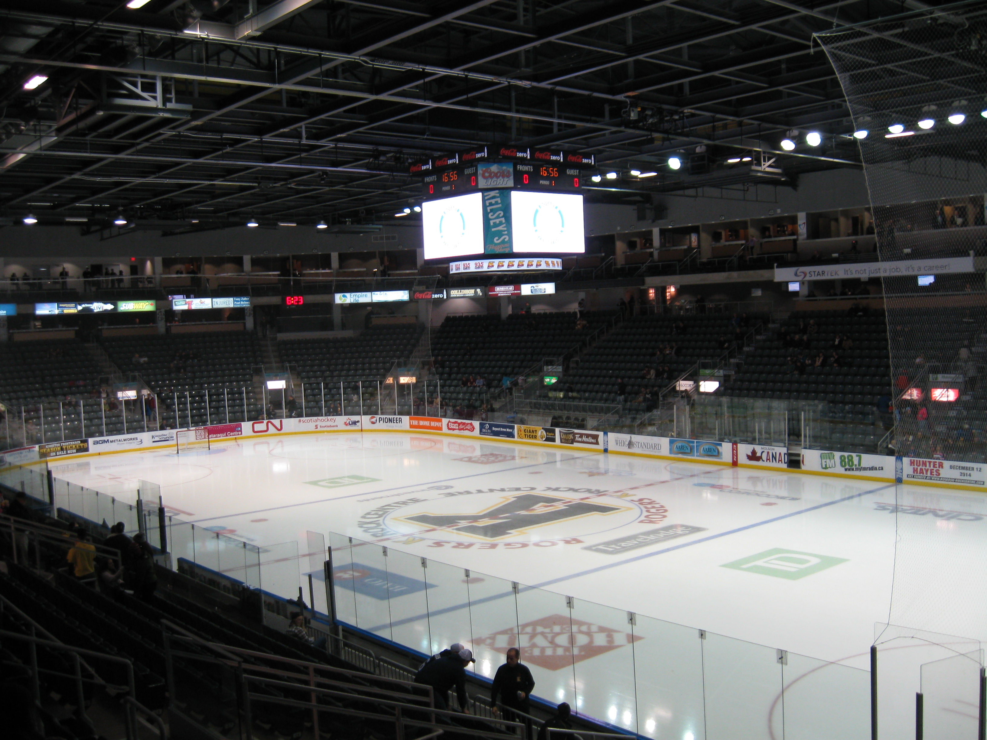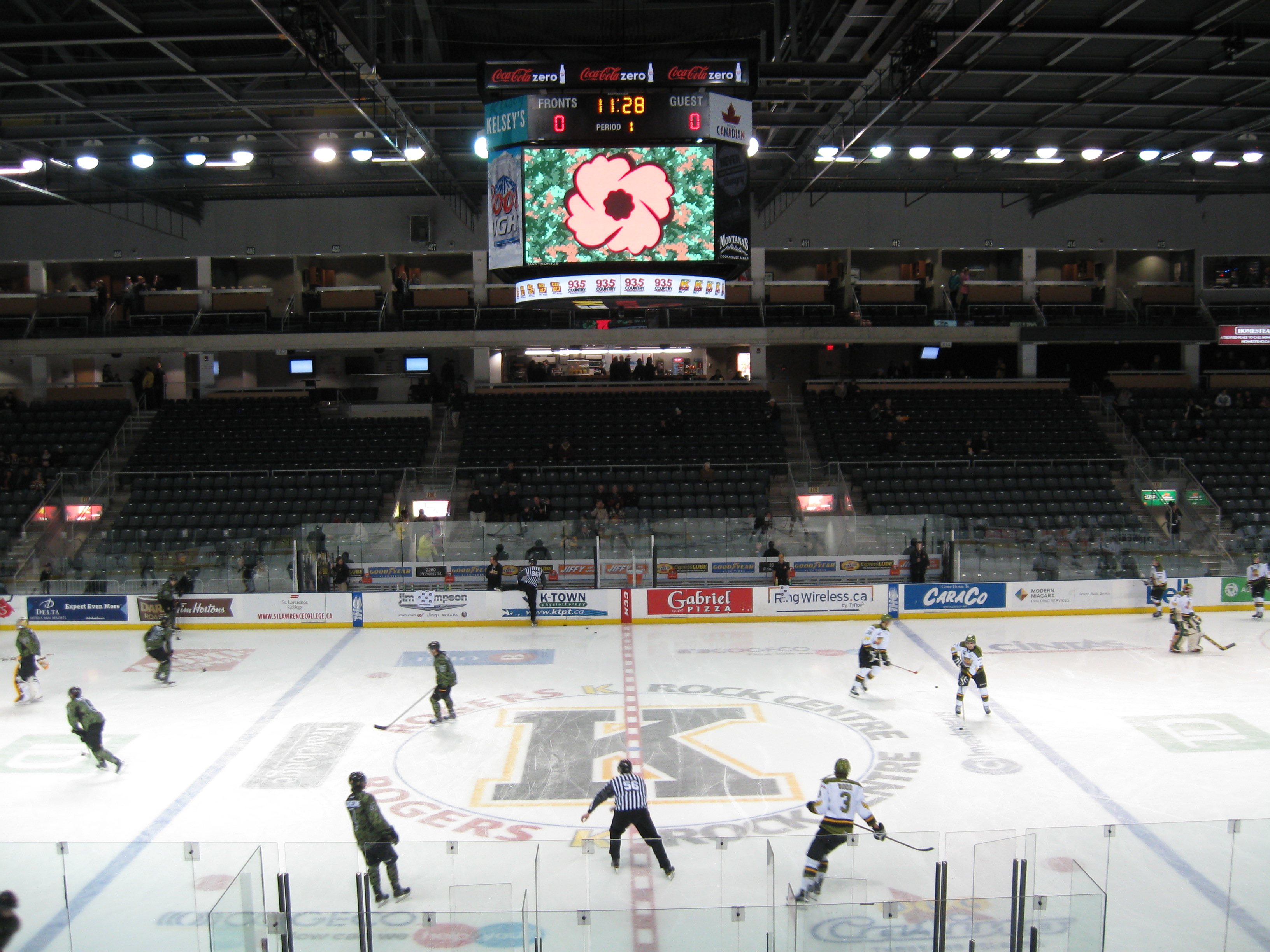 On a Friday Night when the military was honored, there were about 4,000 that came out for the game, thus filling the stands 75% of the way. Interestingly, nearly every suite was occupied. Despite the new arena, attendance figures were surprisingly low during the K-Rock Centre’s first few seasons, but in recent times, the Frontenacs have found themselves closer to the middle of the pack in the attendance standings. During the playoffs last season, the team drew a little better than previous short postseason campaigns and the team almost sold out Game 7. Gear for the Fronts was very isolated thru the crowd.