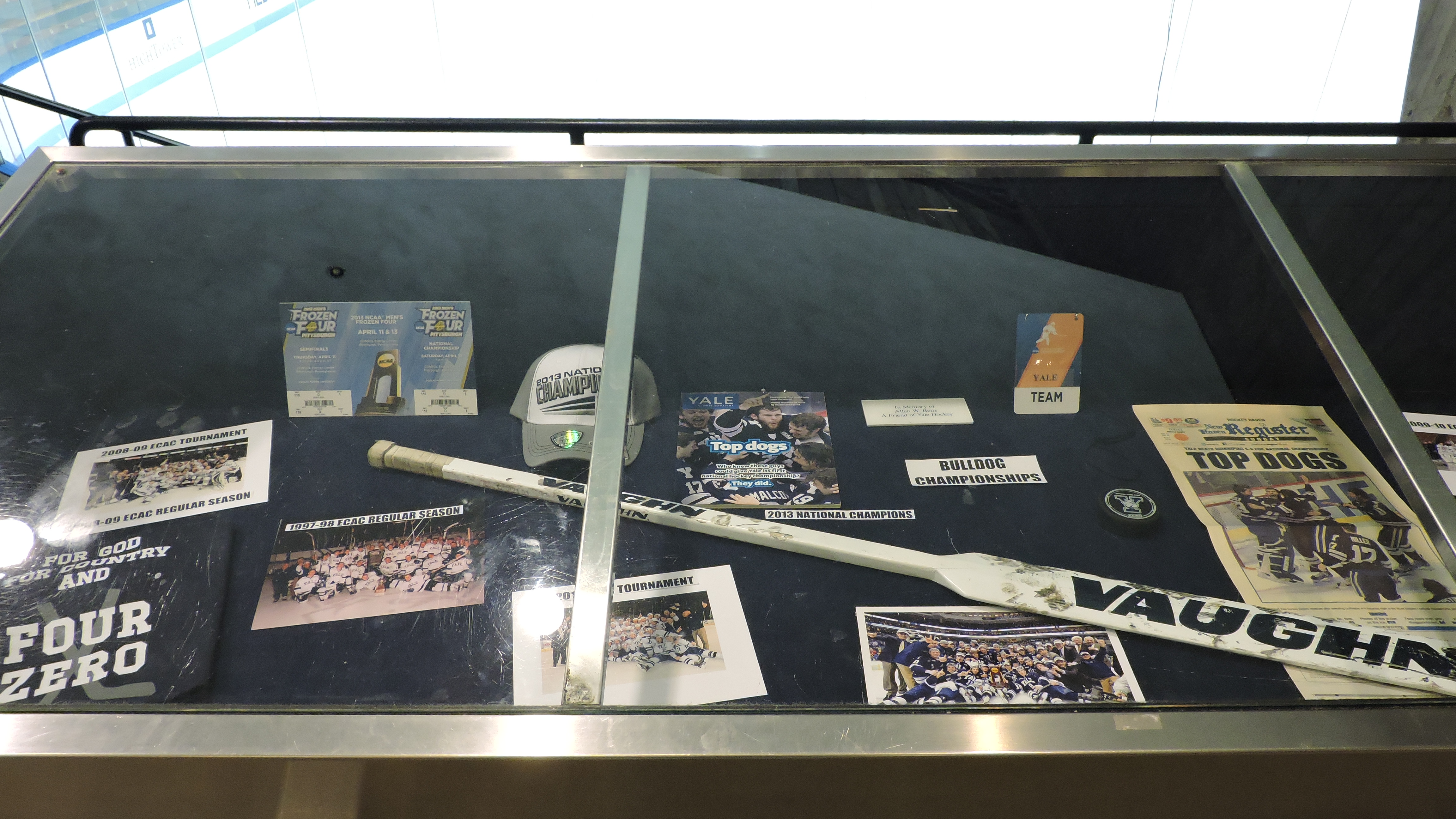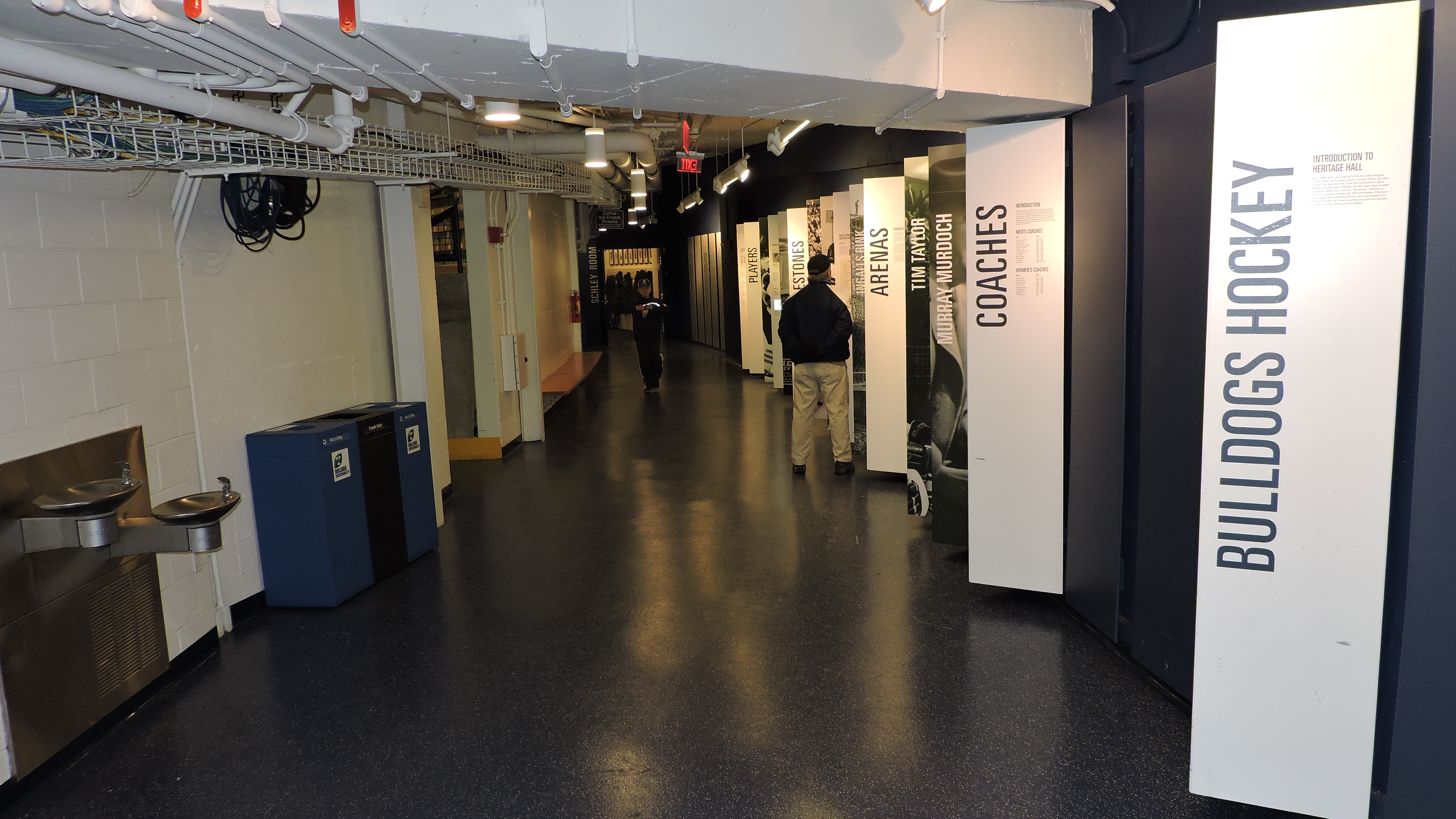 Initially, I walked into the place seeing a small display case with championship memorabilia for the Men and Women thinking that was it. But my world was opened when heading downstairs and seeing all that was done with such little space. Panels on the right-side wall give an informative look at Yale hockey; from the coaches and players to the arenas, milestones and games. On a different wall is a yearly history of the program and for a team that dates back to the 1800s, that is a lot of space to fill. It is a terrific section and it’s too bad that it is not more visible. Back inside, two monster banners display the years of Frozen Four appearances and National Championships. In between and above the scoreboard is a string of team achievements followed by the year. The displays kept getting better the more I found and the final piece that I really enjoyed are the flags for every ECAC team, which include the school’s crest.
