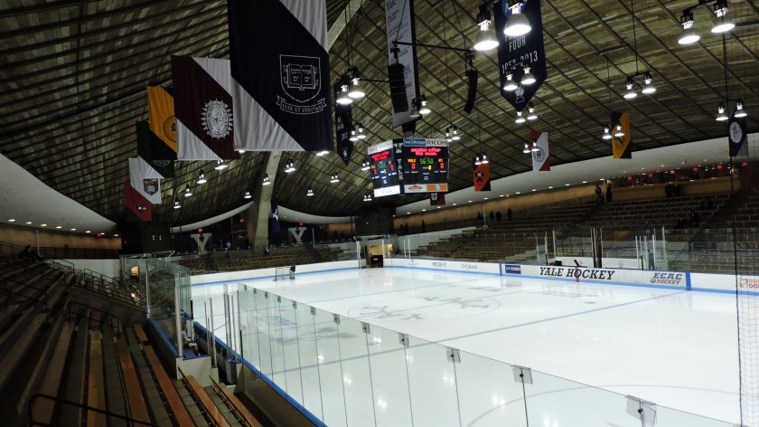 My third trip to Yale was the first one on the central part of campus, as opposed to their sports facilities in West Haven. The prestigious university began in 1701 and can count five Presidents as part of its alumni. Along with the high-end academic allure, the amazing architecture also attracts visitors to walk the grounds, plus Yale is home to several museums and theatres. Intertwined with campus, New Haven is Connecticut’s second largest city with a population of 129,000 and the location is in the south-central part of the state right near the Long Island Sound. Yale’s athletics program is also historic and hockey is no different as the sport dates back over 100 years. While much of that time has been spent in futility (it took 47 years for Yale’s first ECAC tournament title), recent times have seen great success as the Bulldogs made four of the last six NCAA tournaments. Completing the run, was a historic march to the 2013 NCAA Championship as Yale became the lowest seed to win and the first to beat three #1 seeds on the way to the title. The team settled into a permanent hockey home in 1958 as Ingalls Rink was completed. With noted architect Eero Saarinen putting his stamp in the design, “The Whale” is a famed structure both on campus and in the hockey world and a recent 2010 renovation did a nice job to improve it.