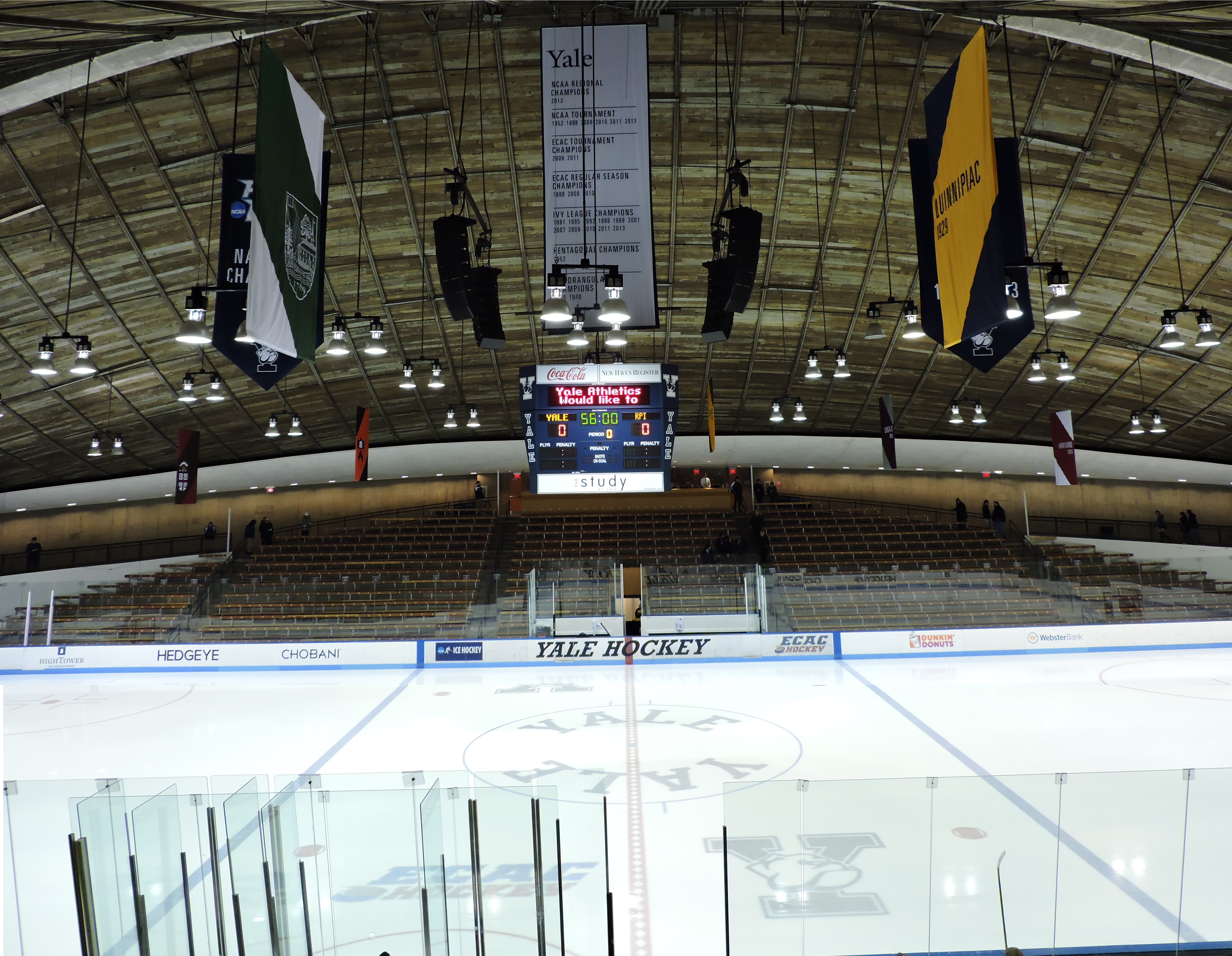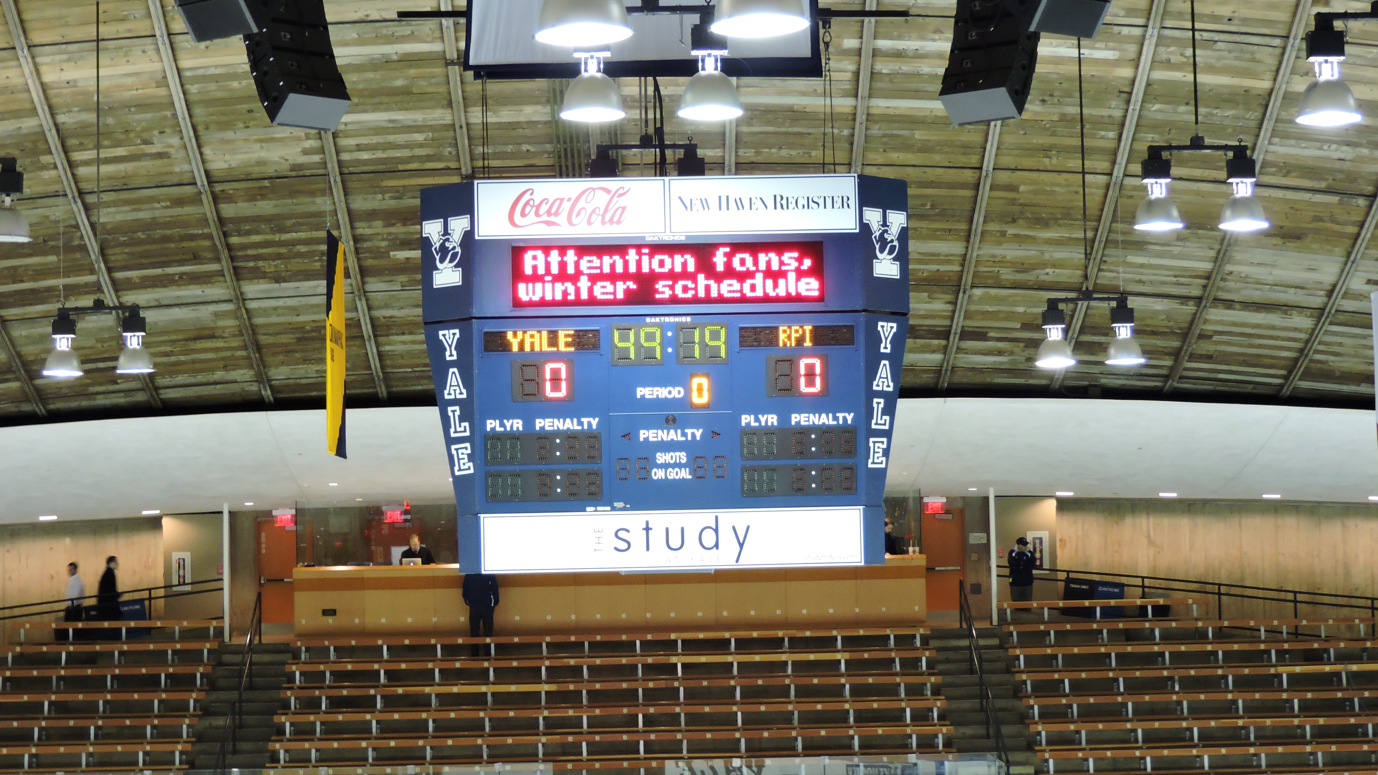 Above center ice is a four-sided blue board that came with the 2010 renovation and is a nice fit in the arena. A dot-matrix board at the top scrolls ECAC scores during the game. There are some advertisements, while the corner panels say “Yale” with the Y logo.