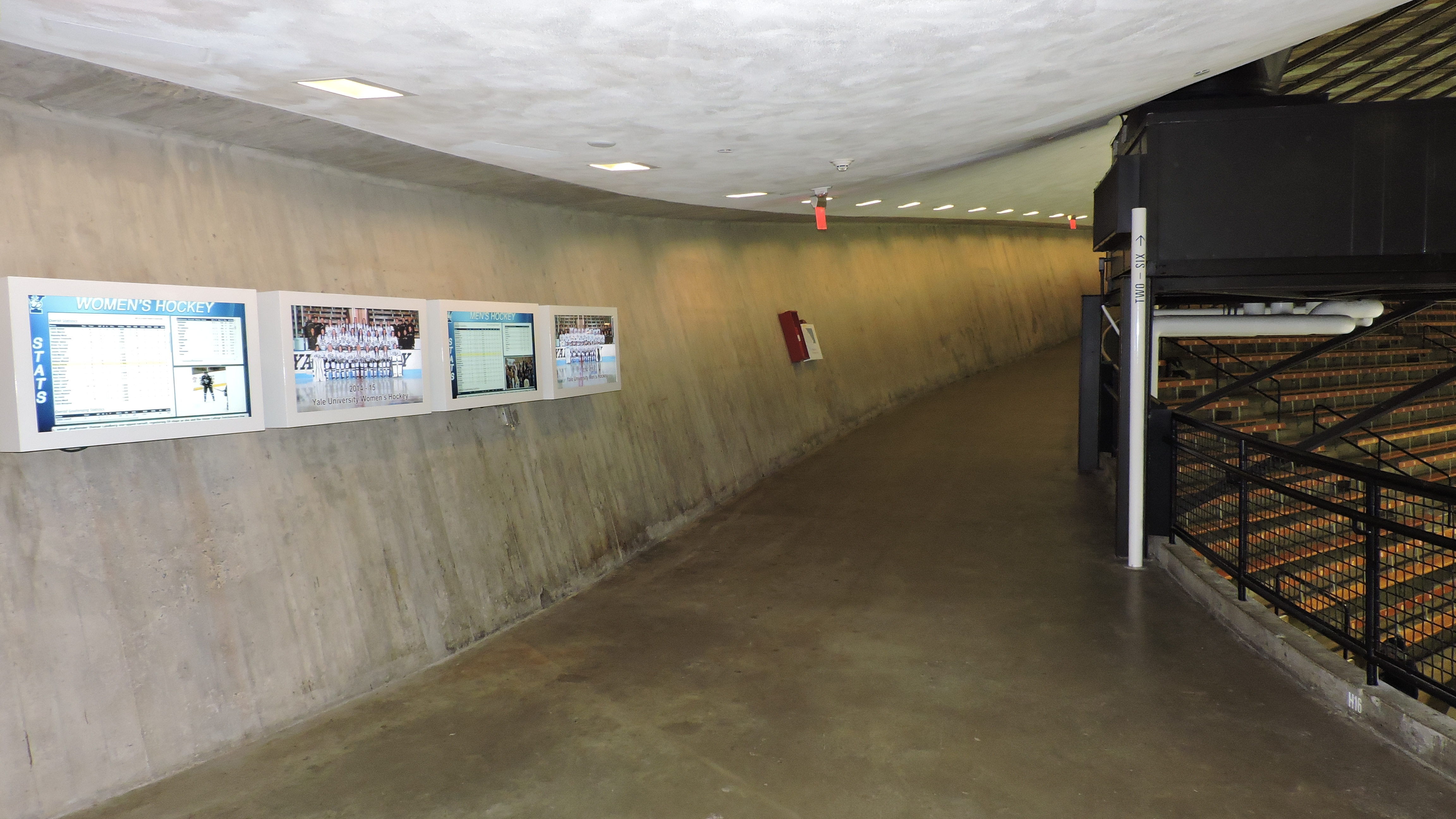 The south end is the main entrance (despite the parking garage being on the other side) and you are essentially in the rink once past the initial doors. Cold, drab concrete lives throughout the inclining walkway which ebbs and flows around the arena, above the seating bowl. An odd digital board providing stats and team pictures sits on a wall. The north end (better decorated in blue with Yale logos), features a set of bathrooms and a concession stand. Back at the other end, stairs lead to a somewhat hidden area down below that includes a renovated hallway full of white and blue with great displays. This section, though still cramped, also includes a food and merchandise stand.