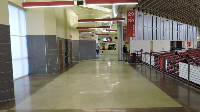 The main foyer feels much more like a student union than a basketball arena, but nonetheless, it is large and modern. Undulating wooden panels on the ceiling and a huge school logo are the most prominent features. Doors straight-ahead lead to floor access for the main arena, while stairs on the side go up to the primary level. Upstairs, looking over the seats and court below, is a spacious end area that goes off on either side to a more natural concourse. Even though a little identity is missing, this concourse section is excellent. There is room for multiple concession stands, but only one was open for the basketball game.