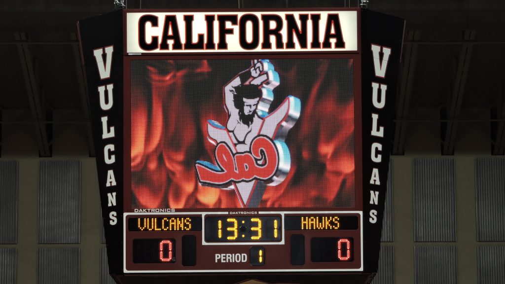 This is almost an ideal scoreboard as the only thing it lacks is a better picture. Each of the four sides are dominated by the video screen and the bottom features score/time, while at the top it says “California”. Corner panels spell out “Vulcans” vertically. For additional player stat information, a flat board is located near the corner of each side wall.