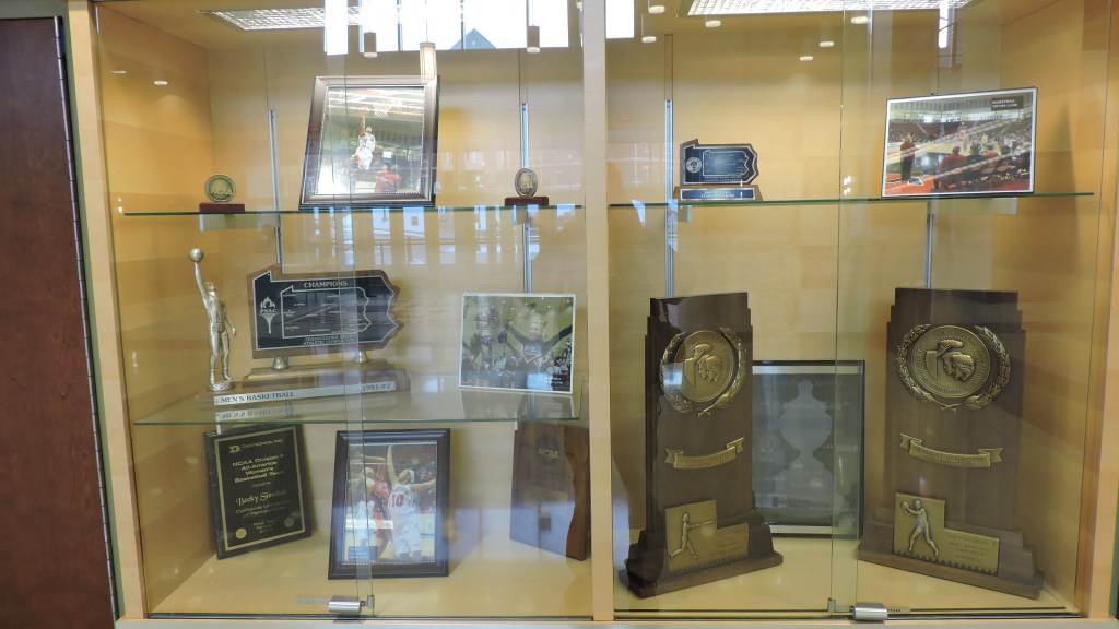 Outside of Hamer Hall, the old gym for Cal U, there is a great bronze statue featuring the starters of the 2004 Women’s National Champions team. Not sure why they didn’t just move this to near the Convocation Center entrance. Most of the displays are inside, in one of three cases within the main atrium and these range from team achievements, memorabilia to opening night pictures. That’s pretty much it as the gym is devoid of any banners, which is my standard for achievement.