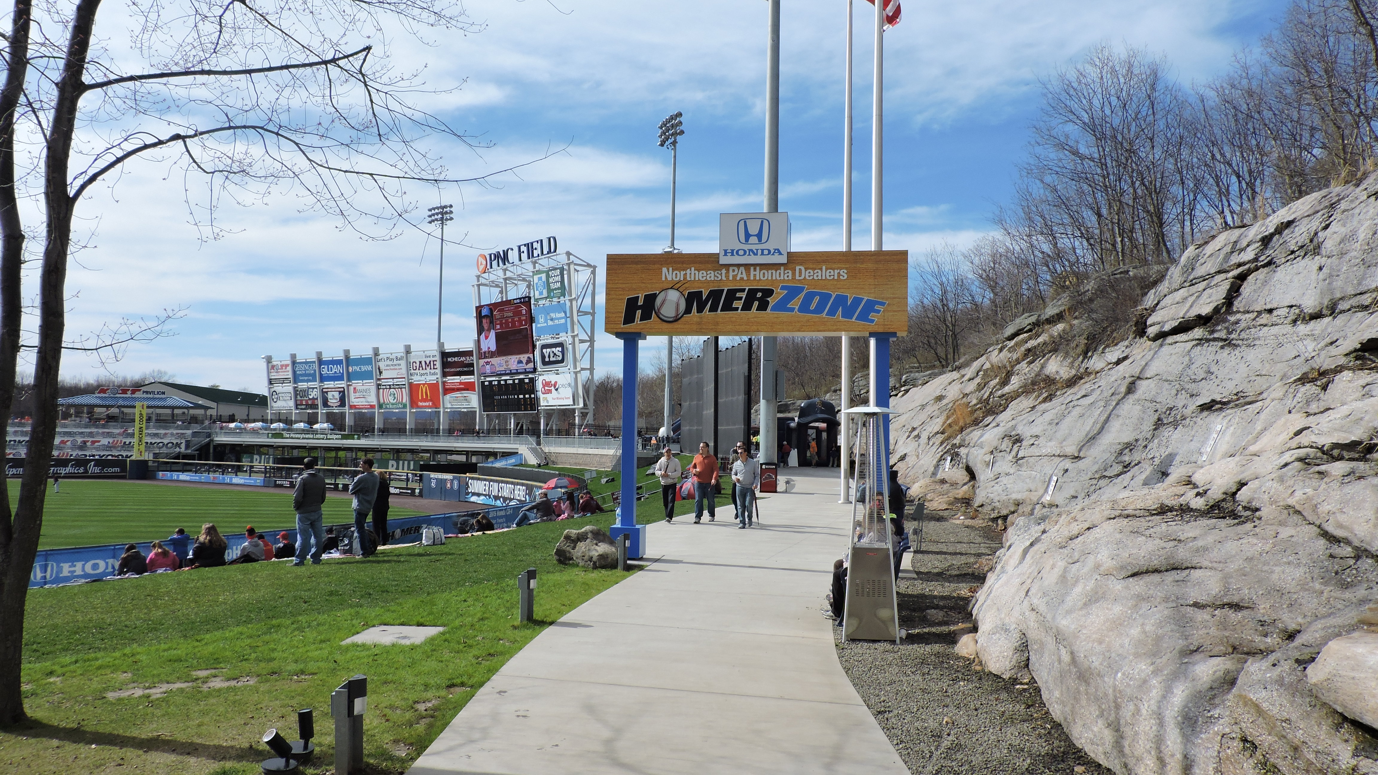 A general lack of team character continues in what otherwise is a sparkling concourse. The wide, covered walkway that runs behind the seats is open to the field has plenty of space and standing spots to watch the game. The view right at home plate is blocked however by the press box. As the concourse leads to the outside, it wraps around the outfield in a 360 degree fashion. The coolest aspect of the park is this outfield walkway that incorporates the adjoining mountainside as the exposed rock forms the right-side boundary. As this leads into the “Homer Zone”, fans can sit on the nearby lawn or take the kids to the play area. Back inside, near the main entrance is the team store, called “SWB Station”. Aside from a few logos on the garbage cans and portable stands, at least the names above each concession stand are related to the area.