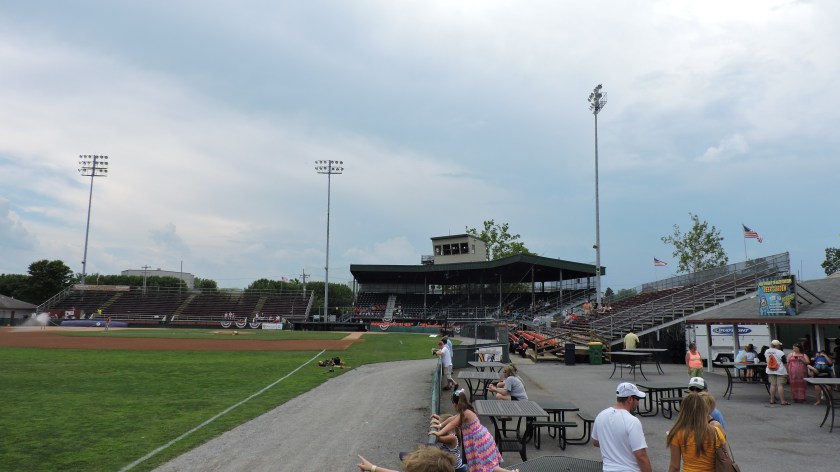 Currently, the Suns are partnered with Washington, which has become a good fit thanks to the proximity of the Nats. Bryce Harper spent some notable time with the Suns and the team has done quite well with several playoff appearances. While the last league title came back in 1981, Hagerstown has come close the last two years, losing in the championship series……It only took six weeks for Municipal Stadium to be built in 1930…..In 1990, George Bush became the first sitting President of the United States to attend a minor-league baseball game when he came to Municipal Stadium……I saw a nice gesture at this game by one of the teenage fans, who gave a bat she won in a contest to a younger fan that badly wanted it. Great to see that……Dugouts are located much closer to home plate, providing for an unusual set-up to players……Another quirk is the slight rise in the left portion of the outfield. This natural oddity is a result of a limestone deposit that made it difficult to completely flatten out.