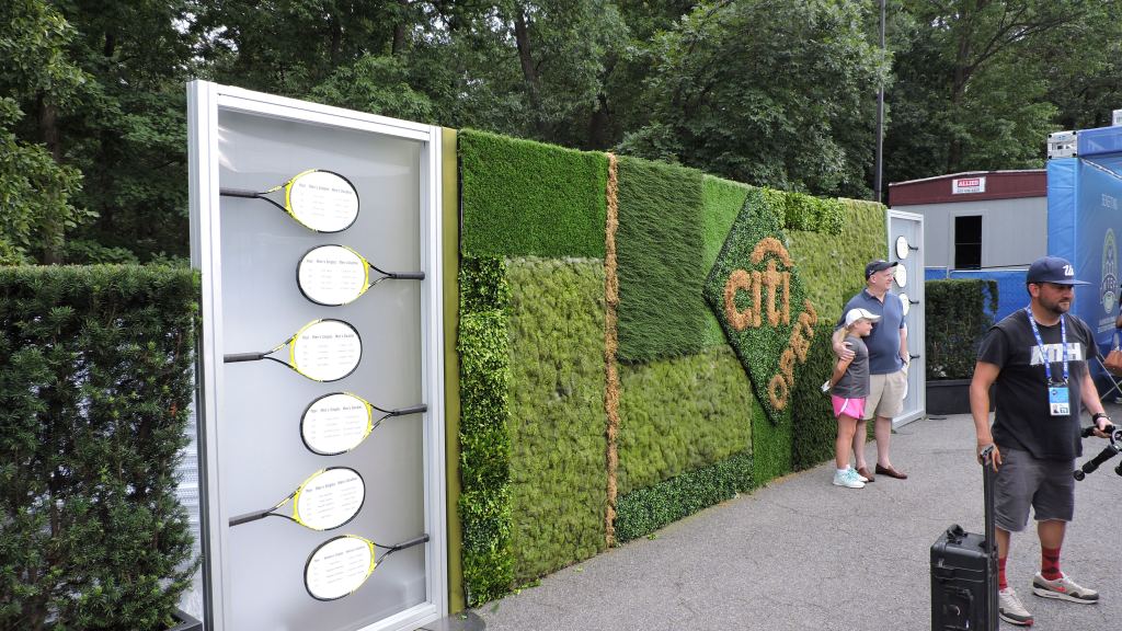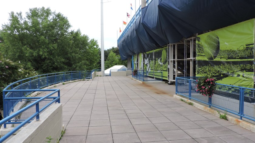 With a tournament rich in history, it’s good to see multiple recognitions for past champions. Near the less used South Entrance to the complex, a wonderfully landscaped “Citi Open” display is centered between a mantle of tennis racquets that features each tournament champion. A better display is inside the main stadium, where the blue façade above the suites include the year and champion. They even unveil the new champion at the end of the event ceremony. Up top around three sides of the seating bowl is a series of country flags, which look like they represent each player in the field.
