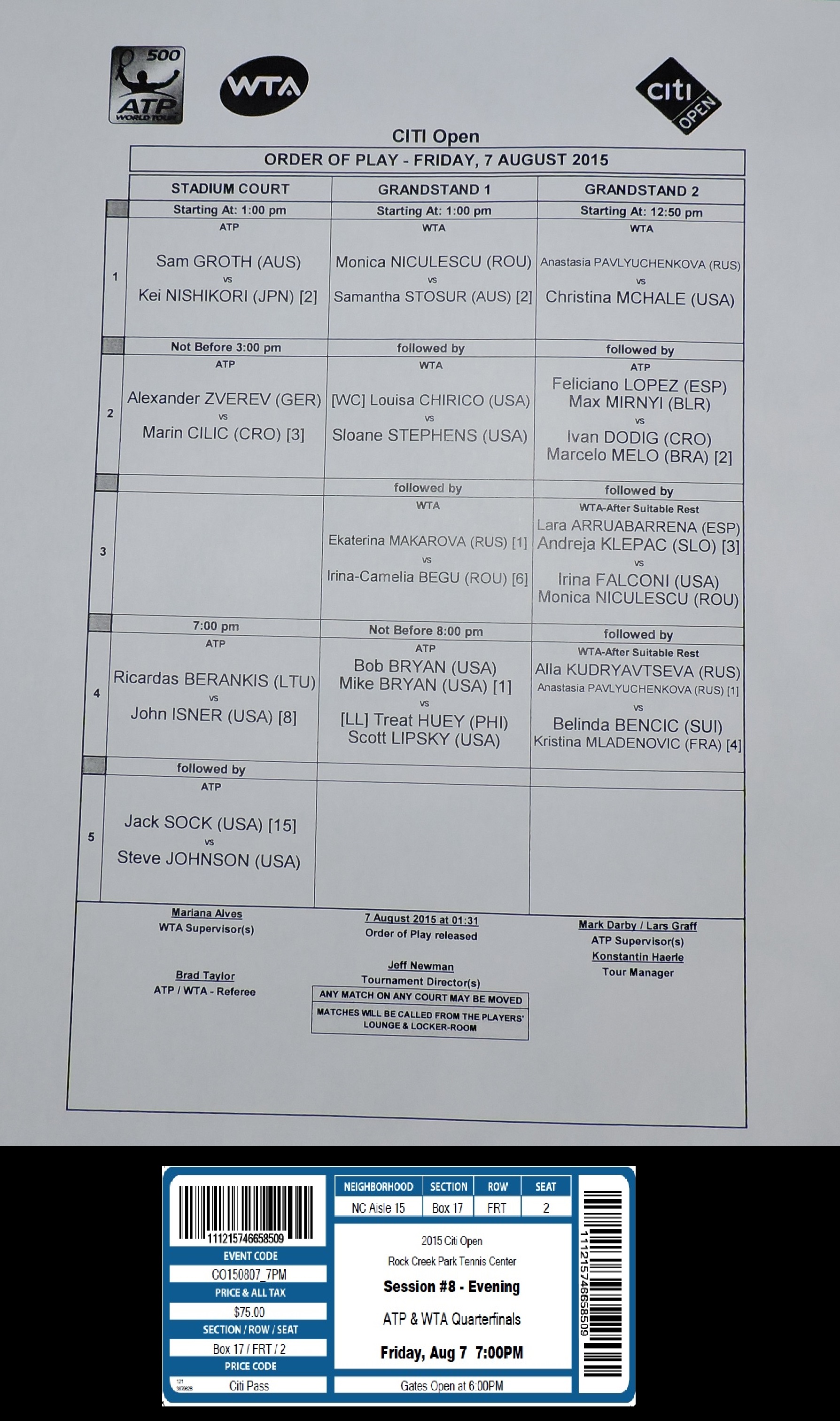 The facilitator for this event was the great Arthur Ashe, who wanted to see a tournament event in a park, instead of the usual stuffy country club setting that ruled the day. The integrated neighborhood near Rock Creek made for the right spot. Ashe played in subsequent years and won the event in 1973……While I know the Tennis Center name, it’s been a real struggle to figure out the main stadium title. It’s mostly referred to as the Rock Creek Tennis Center, but then there are occasions I hear it named after William H. G. FitzGerald. Then, the actual lettering on the stadium says “The William R. Morris Jr Memorial Stadium”, which no one uses and is not even Googleable….For the 2015 event, the Citi Open had by far the worst website out of all the other Summer events. Information for fans was very difficult to find until a few weeks before the event…..The tournament is played on hard courts and for the Men it is a 48-player field (the women have a 32-player tournament).