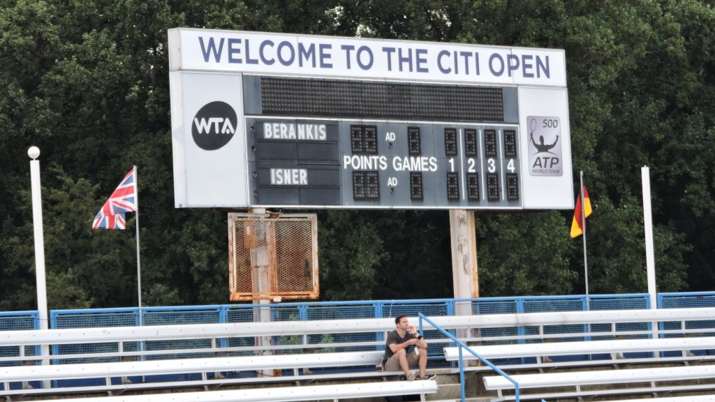 End and corner video boards do an adequate job of displaying score, challenges and serve speed, along with stats during breaks. The quality wasn’t perfect, but there also was no issue seeing the video or the challenge animation. I was particularly intrigued by the separate, old-school boards above the upper side seating. These sun-worn scoreboards catered specifically to tennis with digital displays for points, games and sets. There were no ads and “Welcome to the Citi Open” is spelled across the top. More interesting was the need for a long, sticky pole (think of a gas station) to change the name of the competing players on this board.
