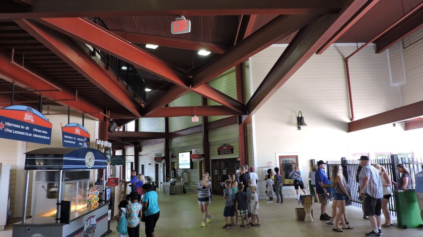 The opening area looks larger than it is because of the tall ceiling and the clean look continues with the siding and high red beams. It’s not ideal that there isn’t a full field view when you enter the stadium, however you just have to walk a little ways on either side and the infield becomes visible. Space is wide, especially further down the lines. On the first base side, picnic tables are set up and beyond that is a large kids playground. There is a walkway that goes around the outfield, but the area is desolate and what used to be “Crabby Cove”, a beach play area with a pool containing bumper boats, now sits overgrown, unused and empty.