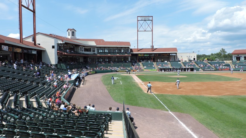 The promising exterior maintained my expectations inside the ballpark, as I was happy to finally not see a place with a cookie-cutter Atlantic League design. Behind home plate is a two-level luxury suite set-up, which cuts back on individual seats down below to about 9 rows. Past the suite level, a more traditional single set of wide green (shouldn’t they be blue?) seats account for most of the 4,200 capacity. The bowl goes a little beyond the infield and what I love is how the section actually starts bending inward, so the last ones are facing the pitchers mound and not the outfield. It’s a great concept; just the fans that sit there better be prepared for foul balls. Towards the left foul pole is the Legends Club, an indoor facility with its own seating section. Out in the outfield is a picnic-section that is well done, though a special ticket is needed here as a buffet comes with a seat. The other side of the outfield includes a grassy area, but this was hardly used for the afternoon game I attended. Not much should be expected of the outside view and a row of elevated ads blocks it out. Clean ballpark aesthetics continue throughout the park as does consistent design materials.