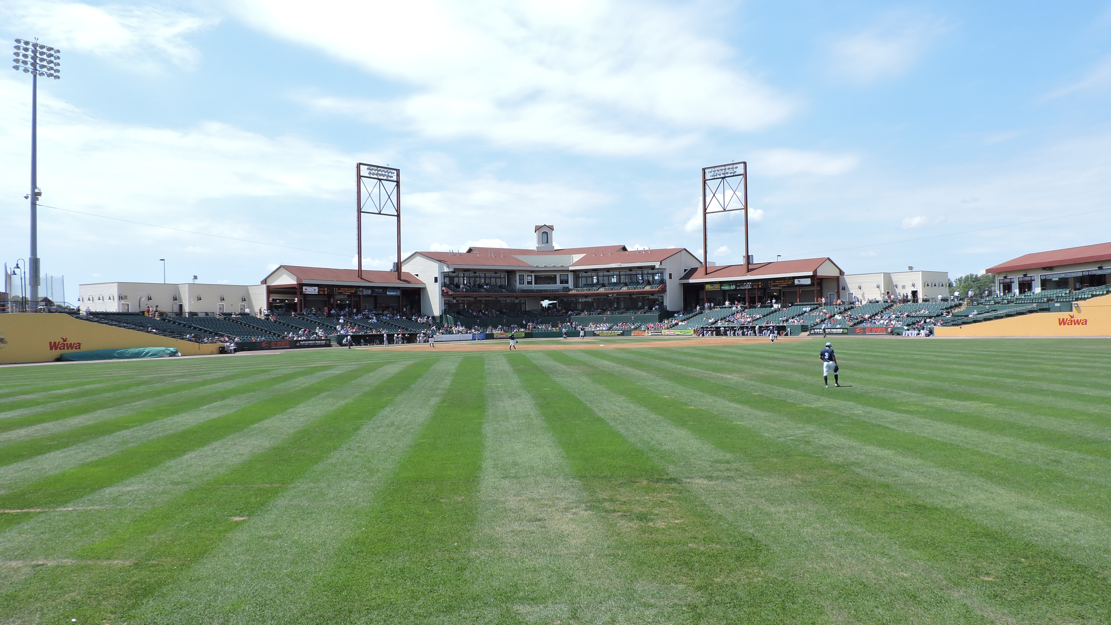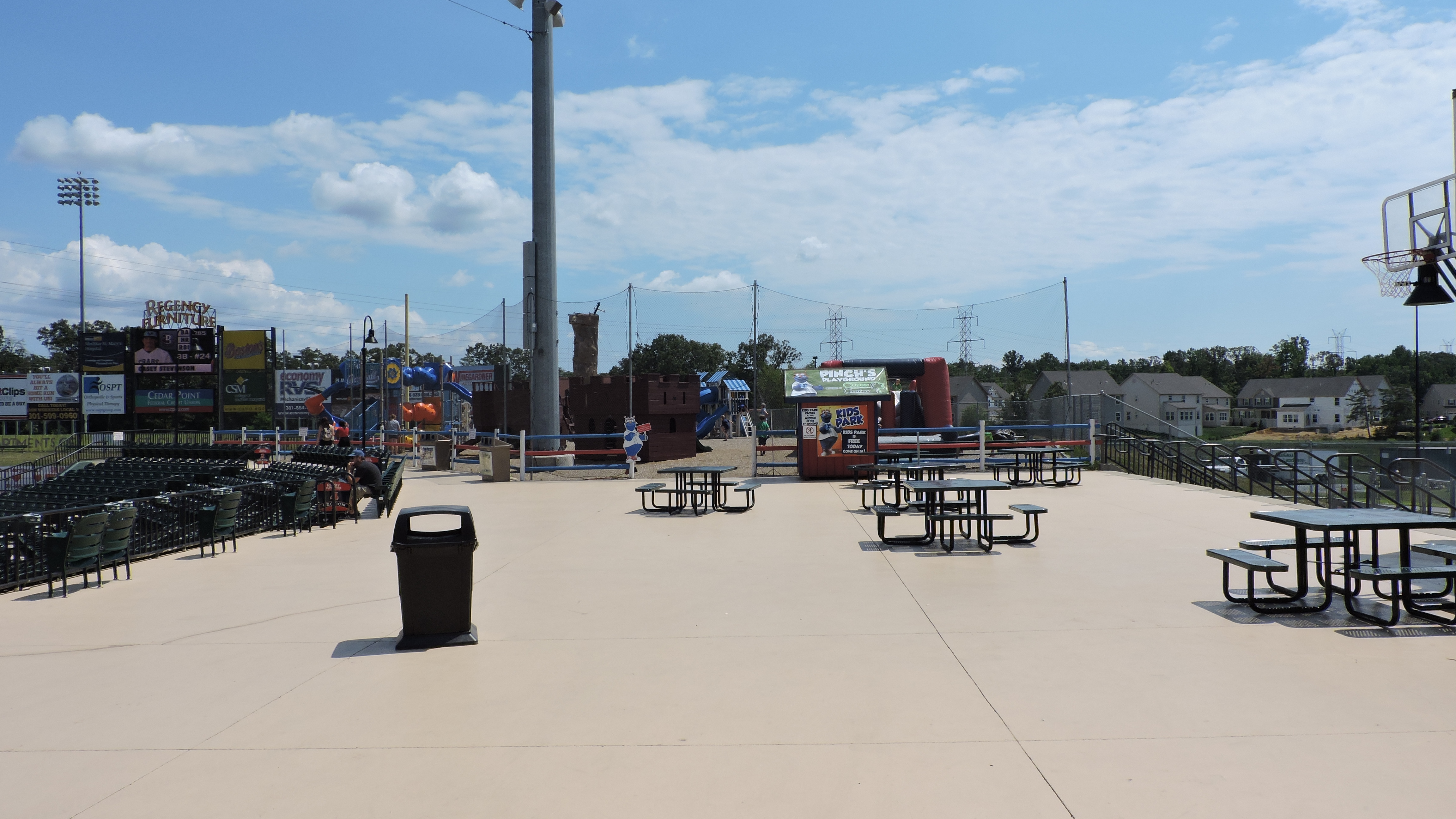 The promising exterior maintained my expectations inside the ballpark, as I was happy to finally not see a place with a cookie-cutter Atlantic League design. Behind home plate is a two-level luxury suite set-up, which cuts back on individual seats down below to about 9 rows. Past the suite level, a more traditional single set of wide green (shouldn’t they be blue?) seats account for most of the 4,200 capacity. The bowl goes a little beyond the infield and what I love is how the section actually starts bending inward, so the last ones are facing the pitchers mound and not the outfield. It’s a great concept; just the fans that sit there better be prepared for foul balls. Towards the left foul pole is the Legends Club, an indoor facility with its own seating section. Out in the outfield is a picnic-section that is well done, though a special ticket is needed here as a buffet comes with a seat. The other side of the outfield includes a grassy area, but this was hardly used for the afternoon game I attended. Not much should be expected of the outside view and a row of elevated ads blocks it out. Clean ballpark aesthetics continue throughout the park as does consistent design materials.