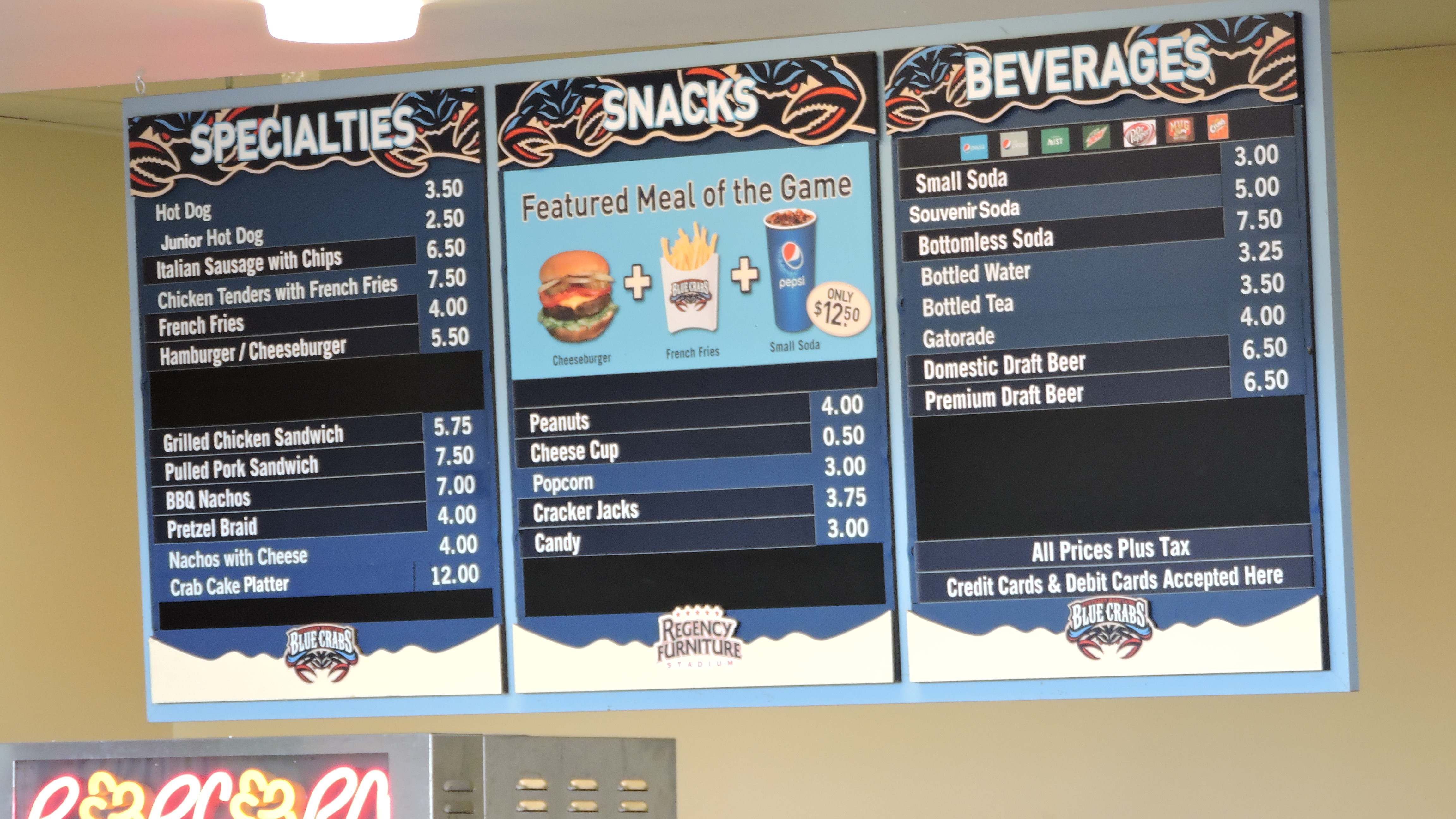 The Blue Crab is a great team nickname, regionally inspired by the species so prominent in the nearby Chesapeake Bay…..As fans first enter the parking lot, the first thing visible is a “Welcome to Crustacean Nation” sign. Though the whole “Nation” line is way overused, the phrase is cool for the use of Crustacean (a scientific shellfish name) and fans have taken well to it…..The addition of little touches throughout the ballpark partially make up for the lack of team displays. Engraved into the chairs in the picnic area is the Blue Crabs logo, while the team store is called the “Crab Shack”…..The team has a few Crab Feasts each season, where fans can buy a $40 ticket and eat as many crabs they want.