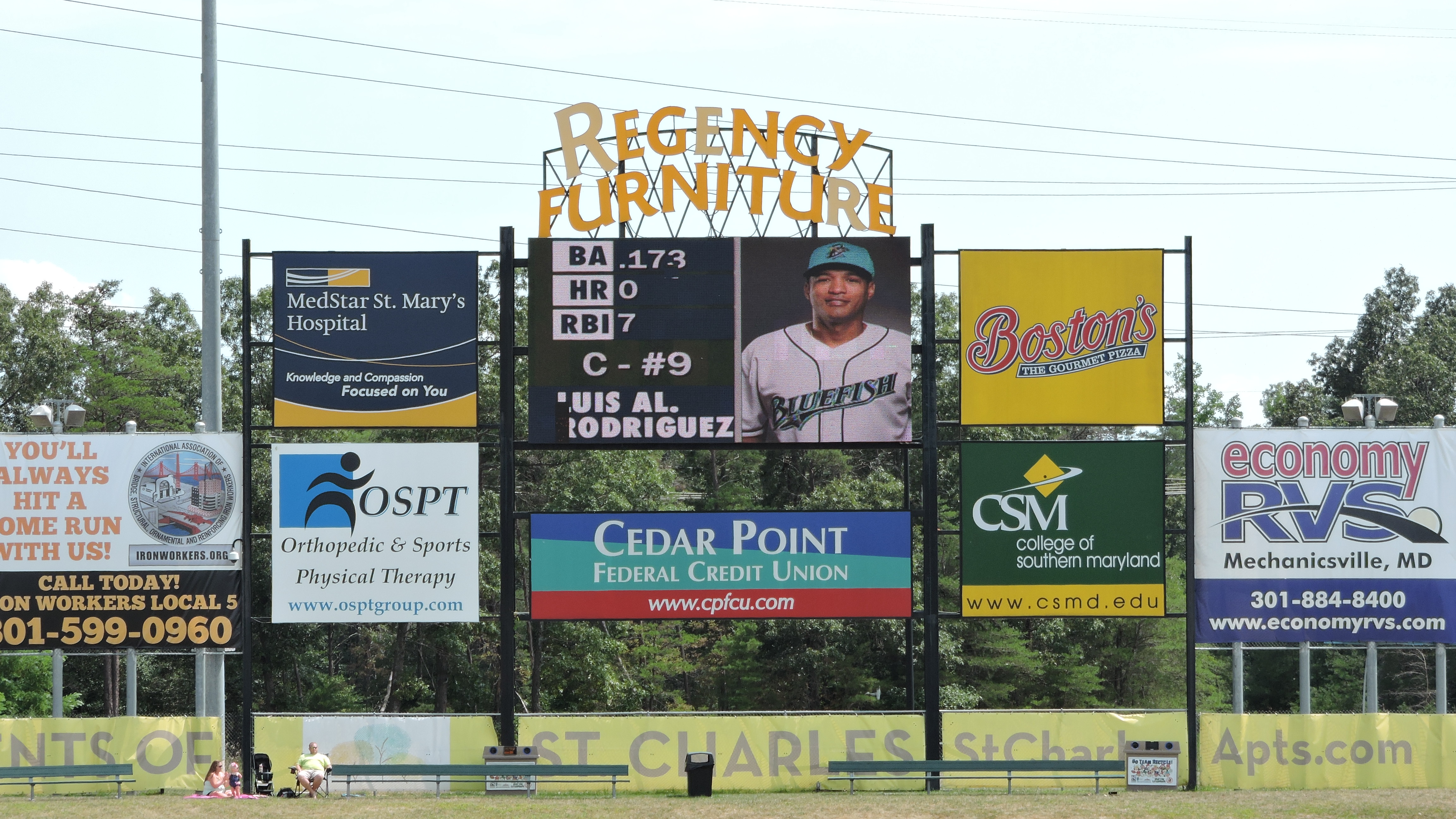 There are multiple scoreboards at RFS, including a couple helpful dot-matrix displays above the seating area. This gives fans the main game info needed when looking towards home plate. A pretty neat hand-operated scoreboard is located on the large, green wall in left-field. Over in right-field, a video screen blends in with the advertisements and this screen is used for player pictures and between-inning video. I wish they put some sort of score info here as it would help those sitting on the third base line. Also, the video board has diminished in quality as a couple missing panels poorly coincide with each player’s name.