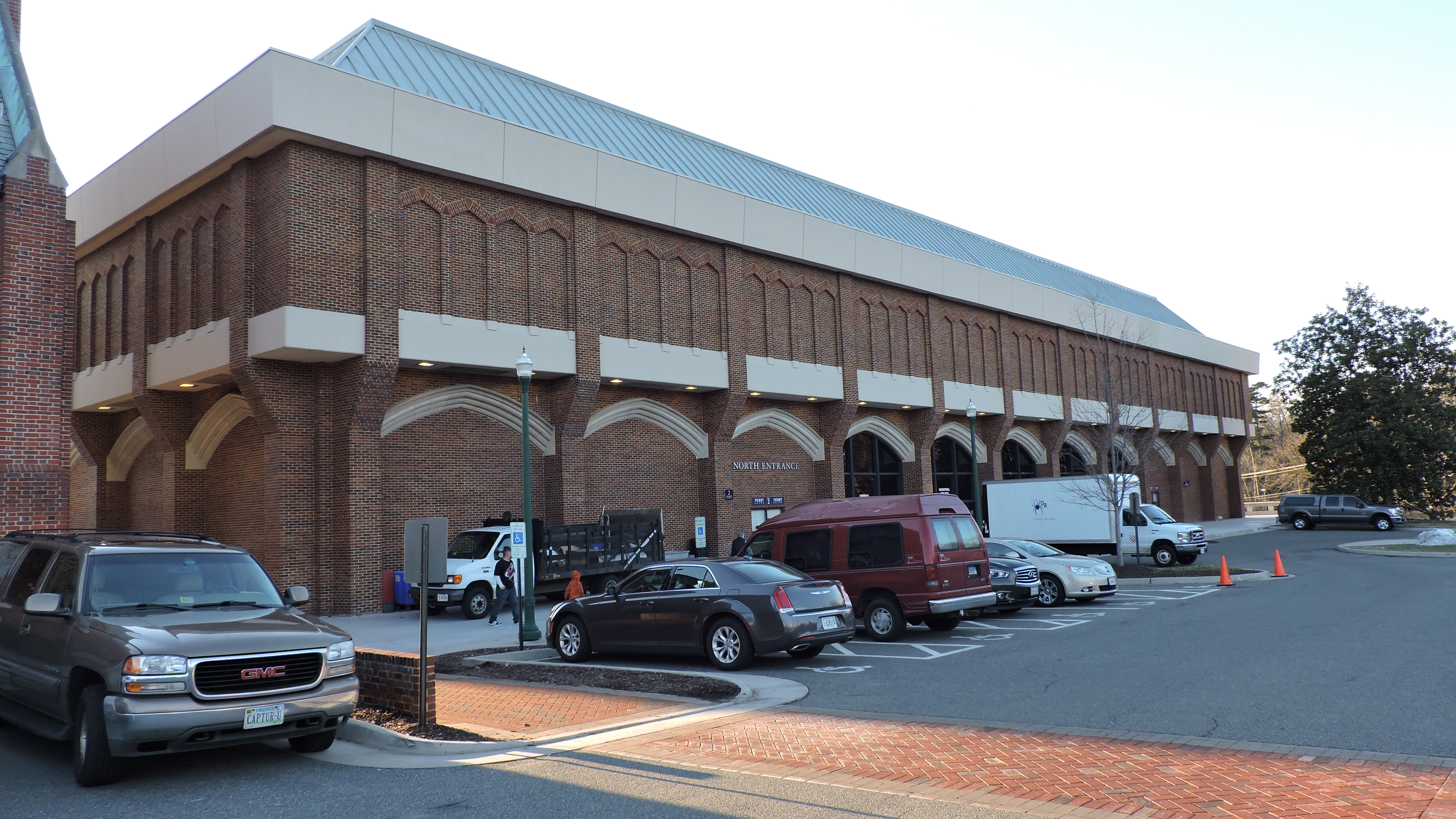 The Robins Center is designed with a consistency to match the rest of campus as it features a brick layout with beige trim. False archways filled in with brick attempt to give the arena a more distinguished look. At the hardly-used front of the building, a small “The Robins Center” lettering can be seen on the façade. The square facility was built on a hill, so the north entrance’s ground level sidewalk turns into a mid-level walkway on the west side.