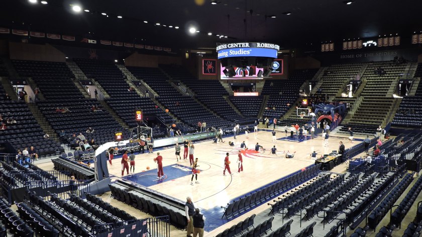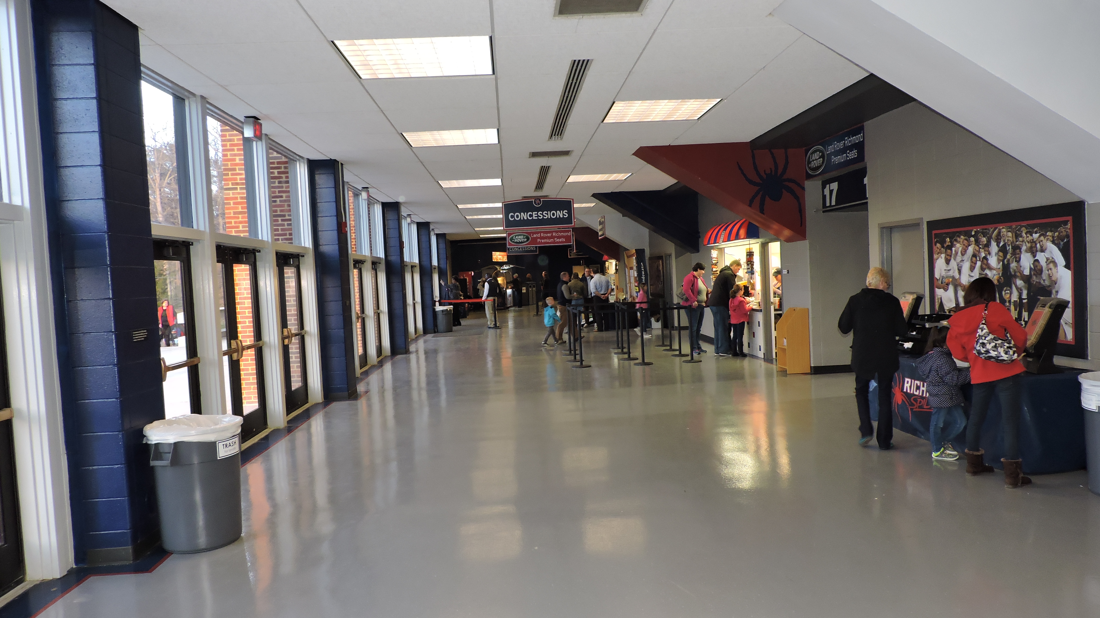 The Robins Center is a terrific facility on the inside and the recent renovation that added premium seating only enhanced the overall design. This is an arena that has the seating close to the court and the rounded rectangular set-up features curved corners so that all seats are aimed towards the action. Rows are steeply separated which allow for excellent sightlines and only towards the lowest 10 rows do they start fanning out, becoming less pitched. Openings to the concourse are in the middle, otherwise it is all individual seats from the floor to the roof. In fact, those blue seats are quite cushy and comfortable and the only bleachers are the two end sections for students. Blue is a prominent color throughout the inside (including the painted roof) and that goes well with the several Spider logos and University wordmarks. The added premium seating reduced capacity by 2,000 and it is a nice enhancement as each upper corner now has a terrace club section. Just the absence of upper-deck seating and uneven lighting can be considered minor flaws. It’s kind of dark at the top of the arena and occasionally, lower sections have a bright light beaming from above. Those are small quibbles though as overall, the Robins Center is exactly what I look for in an arena and the recent renovation should keep this venue that was built in the 1970s going for a long time.