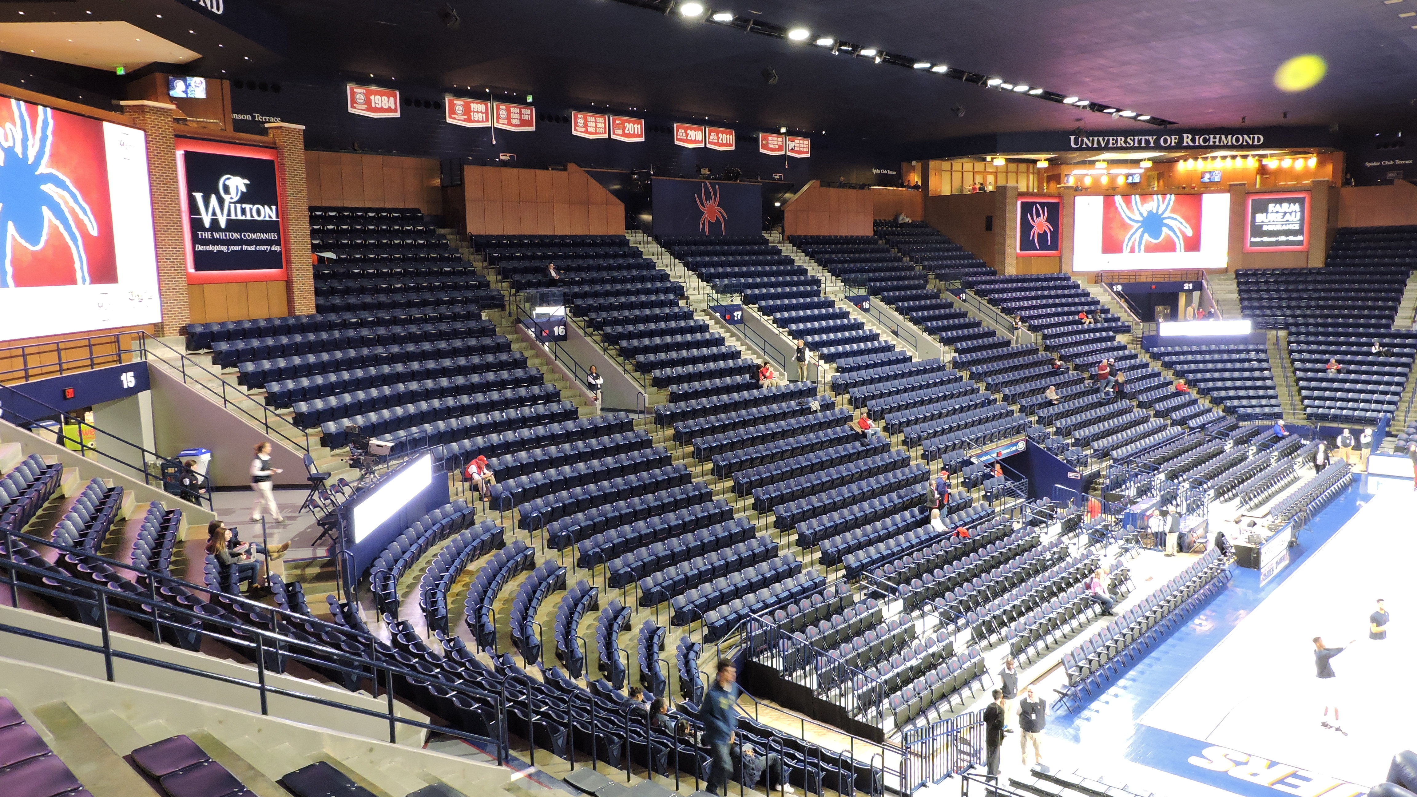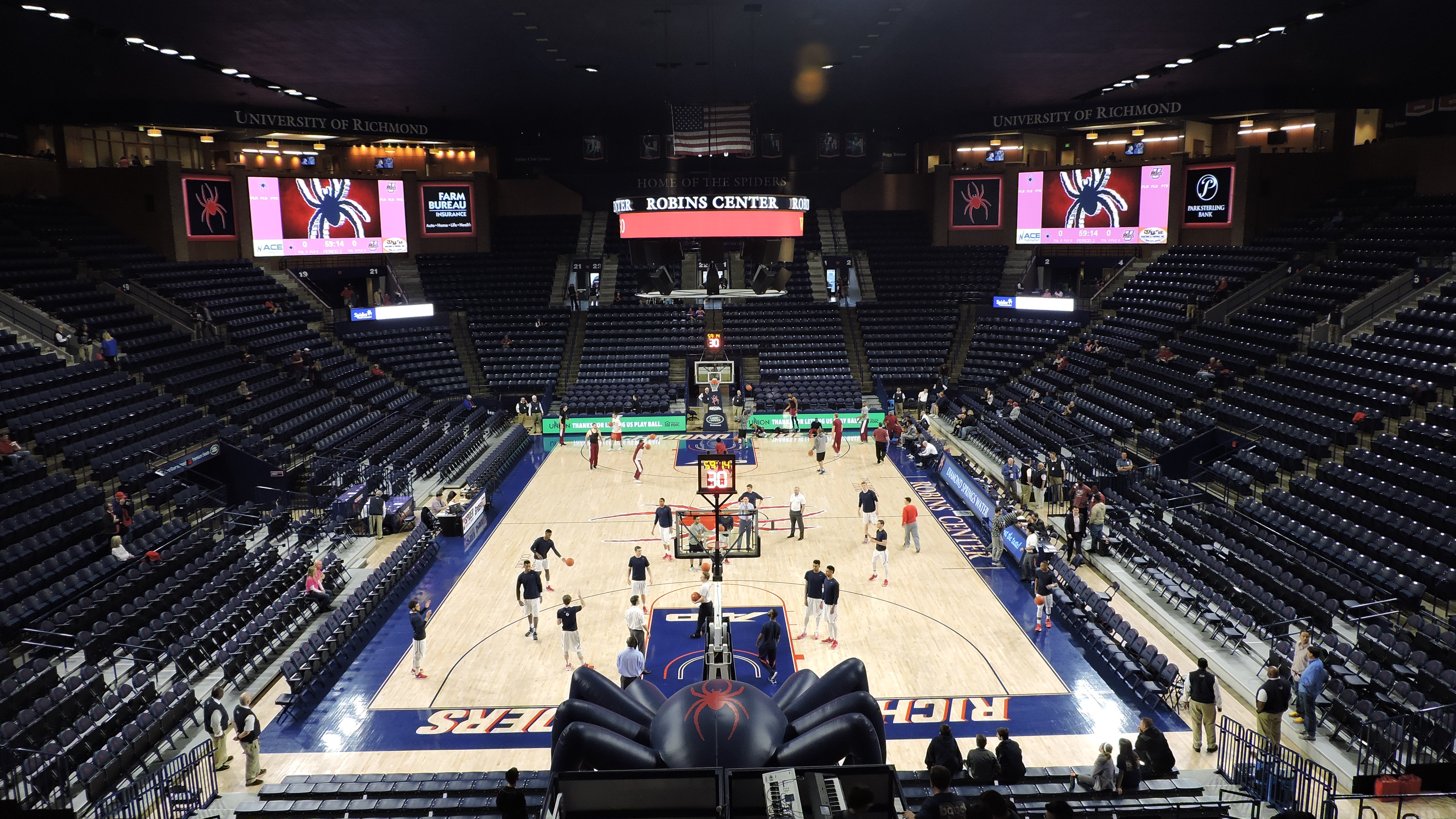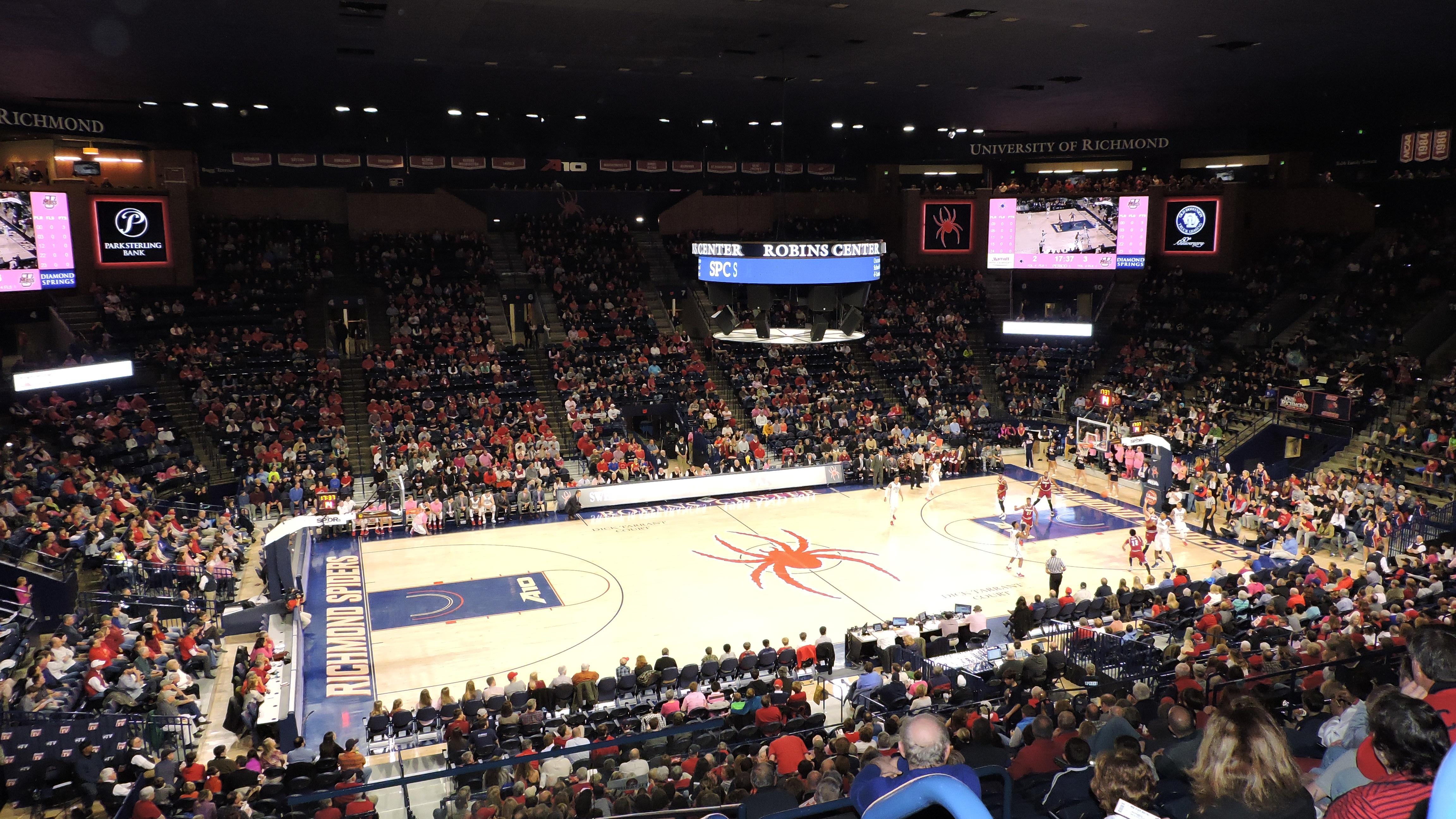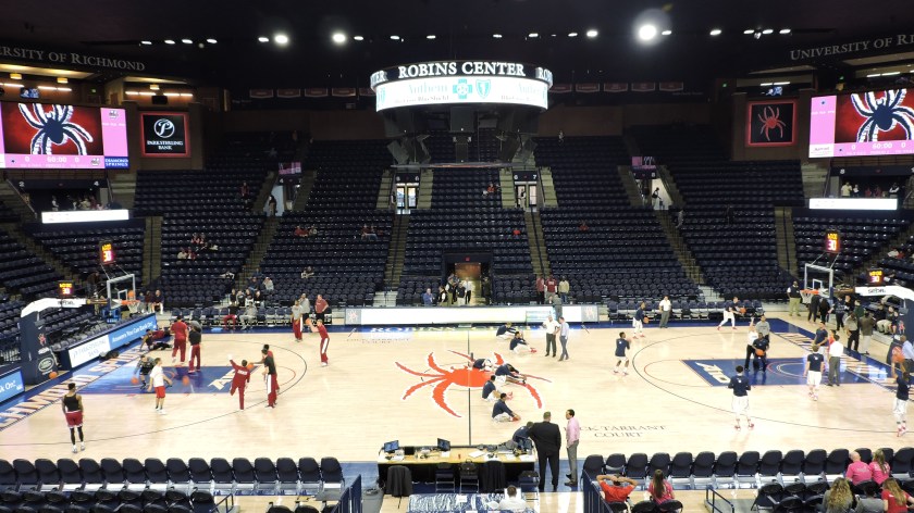 My second venture into Richmond was for some college basketball as I spent the weekend checking out the Division I programs in the city. The last game of the day was at the University of Richmond, a small private school that began in 1830 and features a highly regarded Liberal Arts program. As for the city, it is the state capital and with a population of 217,000, it is Virginia’s fourth largest. Located along the James River in the Piedmont (the central part between the Blue Ridge and the Coastal Plain), RVA is steeped in history, especially from both the Colonial and Civil War era. The Richmond basketball team is a member of the Atlantic Ten Conference and have earned the reputation of a giant killer. Since making their first appearance in the 1983 NCAA Tournament, the Spiders have gone on to become the only team to win as a 12, 13, 14 and 15 seed. With eight wins in nine appearances, Richmond does much more than just make the Tournament. Their trip in 2011 featured a visit to the Sweet 16. The Spiders play in the Robins Center, an arena built in 1972, but significantly redone in 2013. This renovation turned Richmond’s arena into a terrific venue and the interior design is an ideal set up for basketball.