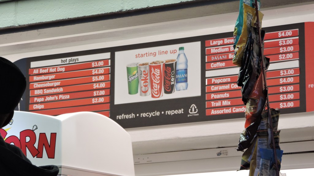 Several food stands are located throughout the concourse, but they all offer the same thing…Hot Dogs, Hamburgers, Pizza and BBQ Sandwiches. None of these include French Fries. It’s a weak lineup that is at least improved by a few portable carts that offer various subs, wraps and sandwiches. There are snacks available too, along with Vegetable items, Yogurt, Kettle Corn and Ice Cream.