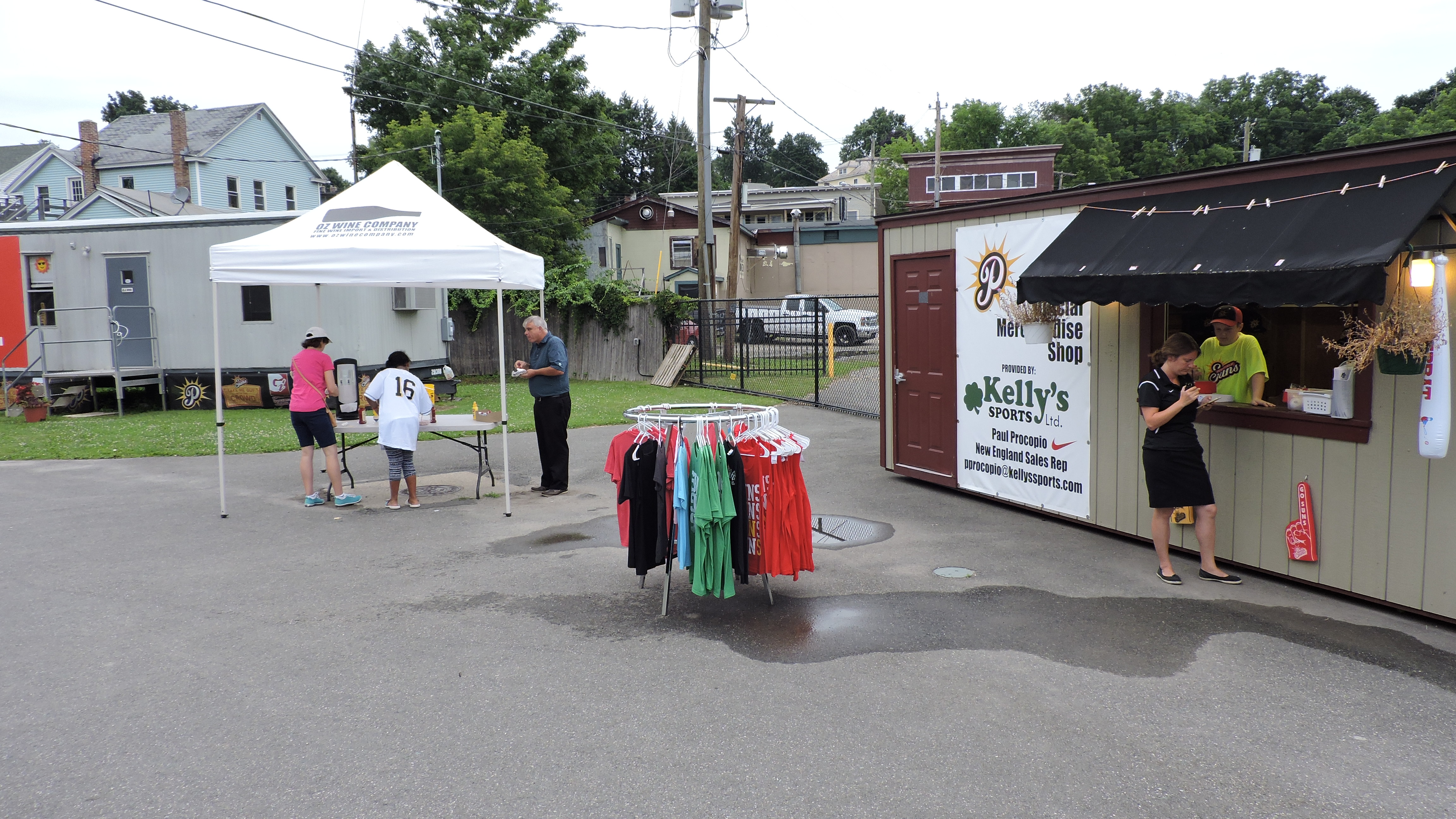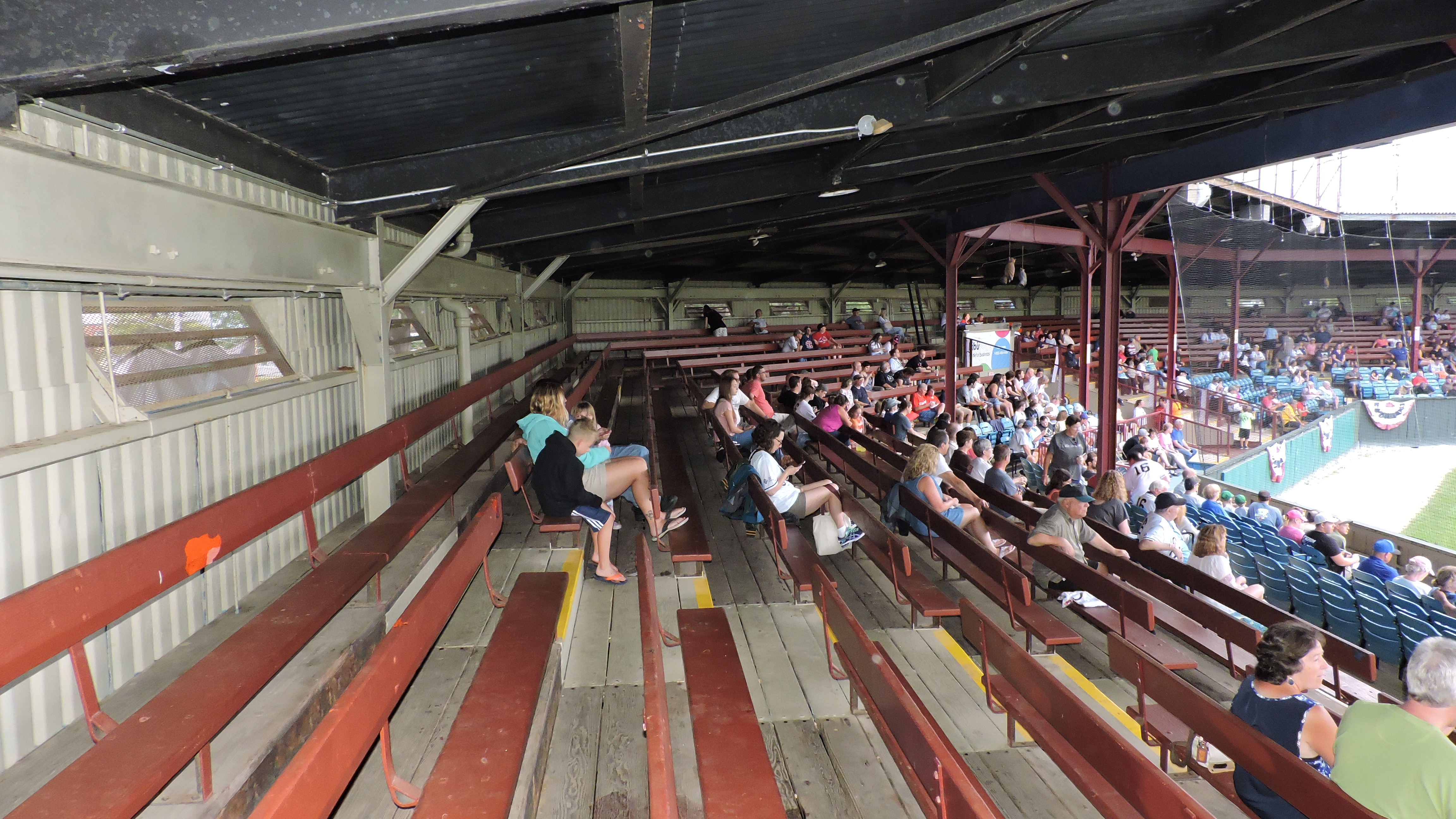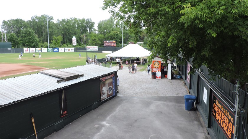 The true essence of taking in a game at Wahconah Park is sitting in the grandstand, where baseball purists and ballpark aficionados enjoy a rare experience. A dramatic home plate tunnel leads into the park where open rows without seats are the means of getting around the ballpark. The seating structure behind home plate is completely covered and that includes the back wall (with only ventilation windows), making for a unique experience, even if you cannot see the full flight of fly balls from the back rows. The grandstand is also quite close to the diamond. Wood is the construction base and most of the seating is uncomfortable, beat up red benches with backs that are tough for tall folks (hence me standing the last two innings). The first five rows have been replaced with individual seats that offer more comfort, but look out of place with their light blue color. Support beams briefly impair the game visual. It is a small seating structure that does not go beyond the bases, so other options include a set of metal bleachers beyond third base that point towards the pitcher’s mound (and necessarily protected by netting). The other spot is the adult hang out on the right-field side. Here, fans can grab a drink at the nearby concession and either stand to watch, or sit at a table near the foul wall. There is also a picnic area further down. Wahconah Park is a unique one that certainly has several drawbacks for fans and is not one of the best pre-1950 active ballparks in existence. However, it is worth putting up with the negative aspects as the historical structure and old-time aura make it an enjoyable, pure baseball experience.