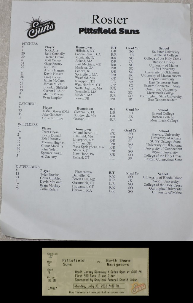 North Shore slowly built up a lead thanks to big bats as they hit solo home runs in the 2nd, 6th and 8th innings (two of them by Colby Maiola). In the 9th, Pittsfield staged a rally as the combination of poor pitching/defense, along with a couple timely singles helped the Suns cut the deficit to 1 run. With the bases loaded and two outs, Al Zachary started with a 2-0 count, however, Navigators pitcher, Quinn DiPasquale came back and got him to strike out swinging to hang on to the win. The Suns left 12 on base and all 9 of their hits were singles.