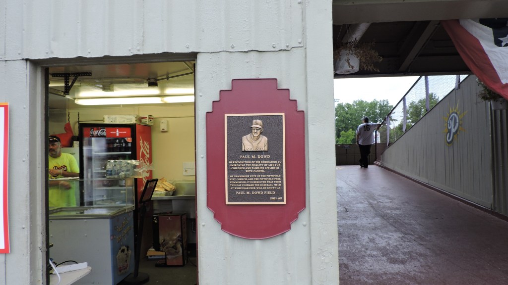 Various signage include the year “1892”, denoting how long this field has hosted baseball. That is the extent of the written history on this old ballpark, which is a shame. The front façade of the building does include two plaques. To the left of the entrance ramp is the first one, which is for the recent naming of the field for Paul Dowd, a humanitarian in the area. On the other side is a marker noting that the first college baseball game was played in Pittsfield between Amherst and Williams. Flags from other teams in the league can be seen on the exterior, along with the logos of the two local high schools that use the field for football.