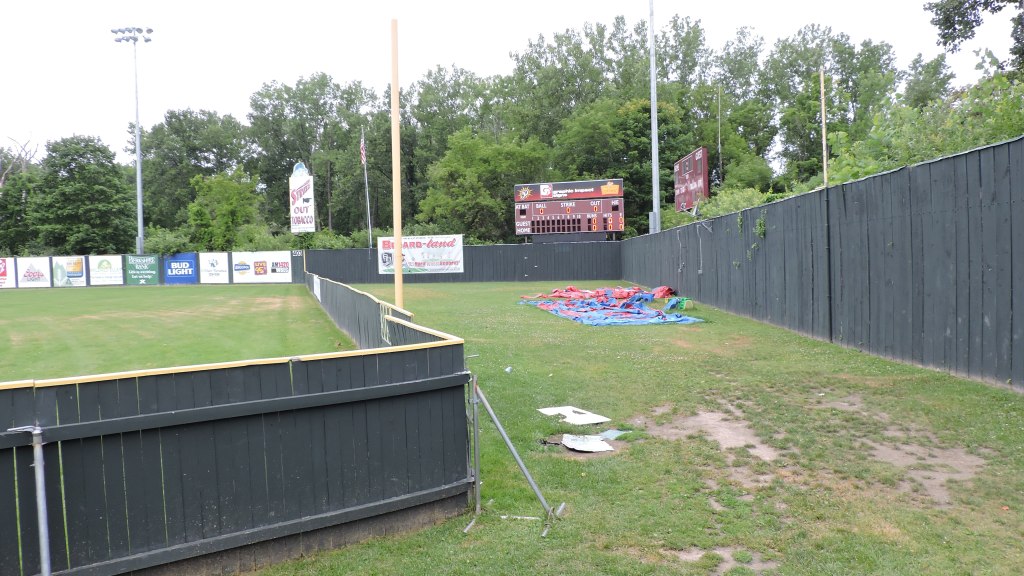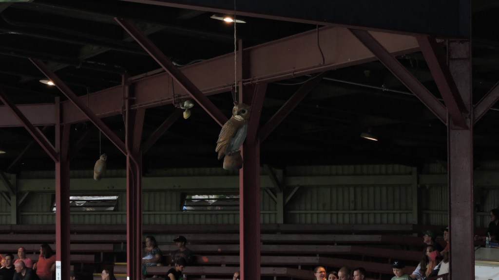 Wahconah Park is a rare baseball field that faces west, into the setting sun (hence the team nickname). It was cloudy on the day I visited, but I noticed center-field mesh netting and the outfield tree placement helps to make the distraction and/or game delay short-lived. The sun in center is played as this sort of cool, unusual thing, but the nostalgia of it wears off pretty fast when you are a fan squinting while trying to watch the game……Hanging from the roof inside the seating bowl are fake Owls, used to deter birds from making nests. That’s not something you see every day in a ballpark……The outfield diminishes are quite awkward at Wahconah Park as the field is also used for high school football. The entire park has a high fence on the perimeters, but that is too far to be the outfield wall. So, a second, shorter wall almost gives the baseball diamond a Little League appearance in right field……On top of the roof is a tiny Press Box and it looks like a scary climb up a ladder to get there……The FCBL is a summer-collegiate baseball league, which is where college players play a two-month season during their vacation from the school year. Wood bats are used and the players stay with host families in town.