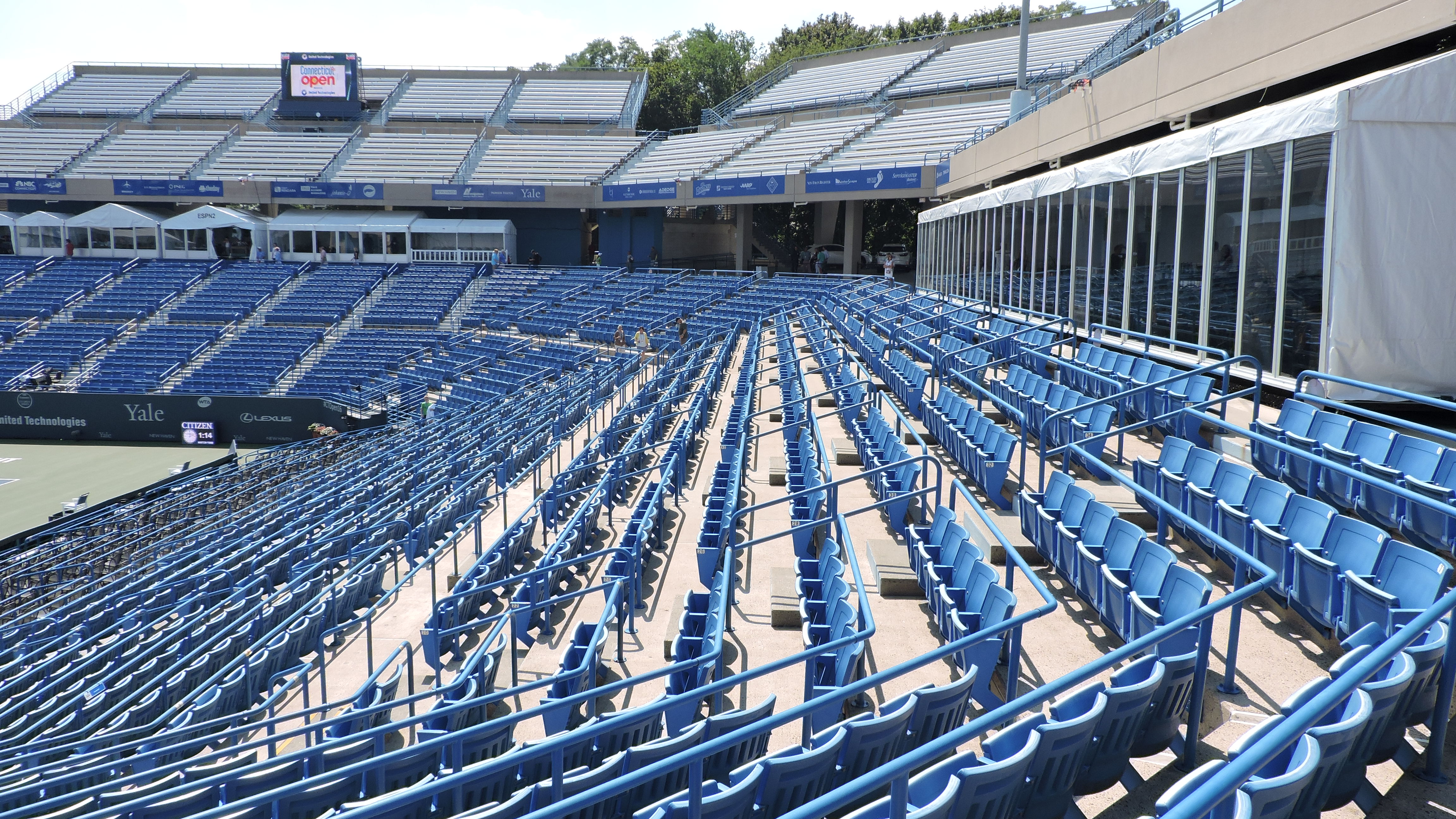 When considering how excessive 15,000 seats is for this place, it becomes apparent that this stadium struggles in a few aspects. The lower deck features an octagon shape with wide, blue seats and a railing in front of each row, though the railing is not necessary as this is not the steepest section. Each sideline has a telescopic section, adding six rows of seats to get fans a little closer. Makeshift tents are carved out of the upper center in each section and three out of four of them are special club sections with the benefit of enclosure, food and drinks (the other tent is for media). A bleacher-style upper level is broken out into sections and the lower one (referred to as “middle tier”), follows the shape of the design below. The upper tier is sectioned off with gaps in each corner. The size of the stadium becomes a disadvantage in that only the lower bowl is open and fans don’t get that nice, high view some enjoy (like me). Additionally, the lower bowl seats extend back far enough where they get to be a good distance from the court and you lose intimacy. The lack of a roof or overhang means that matches from late morning to mid afternoon are played in full exposure to the sun with no shade for any row.