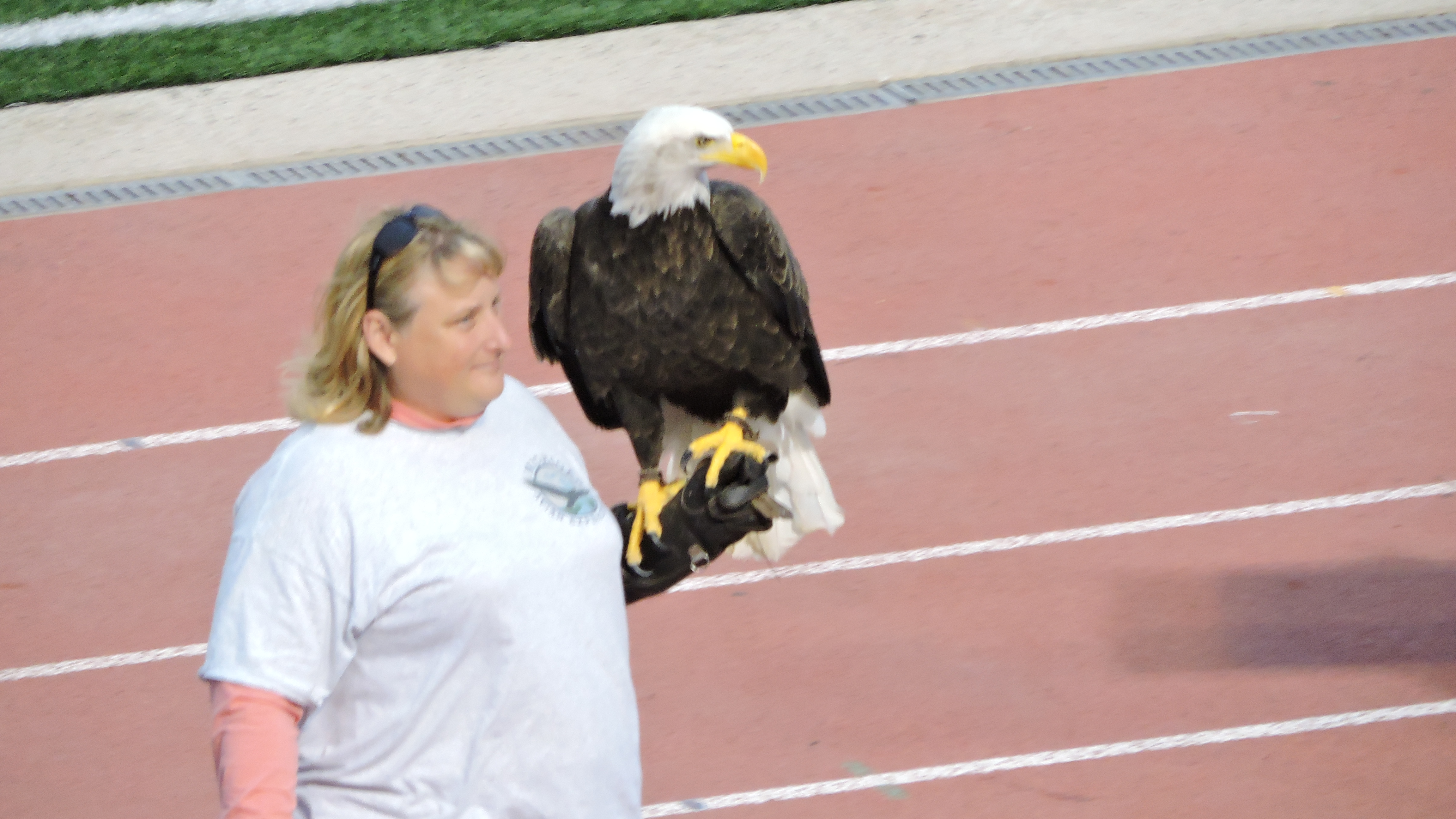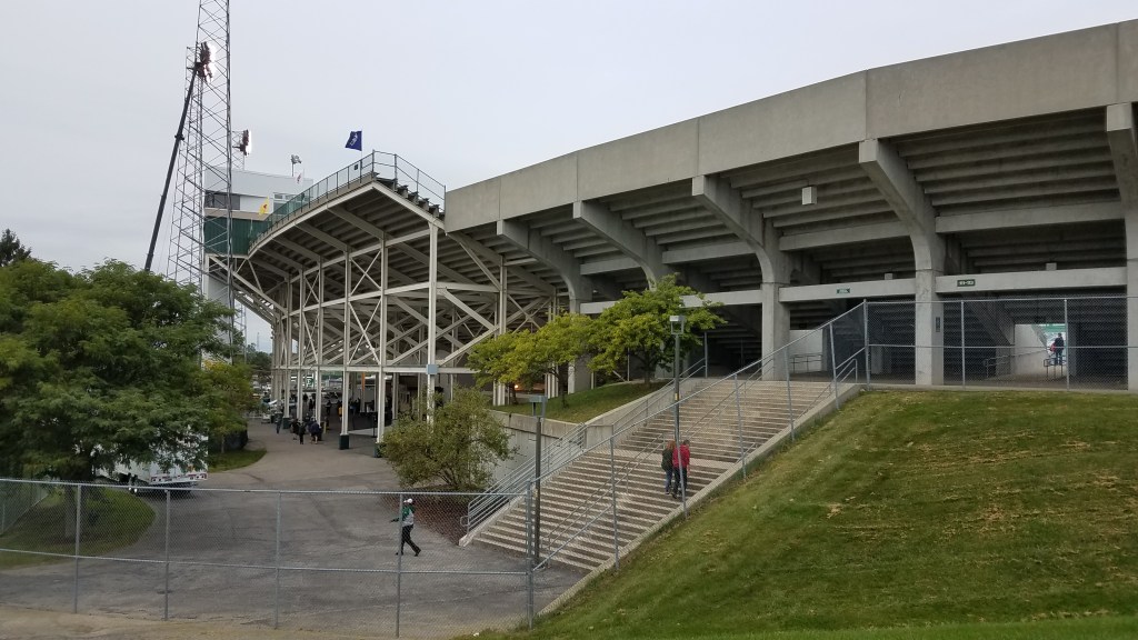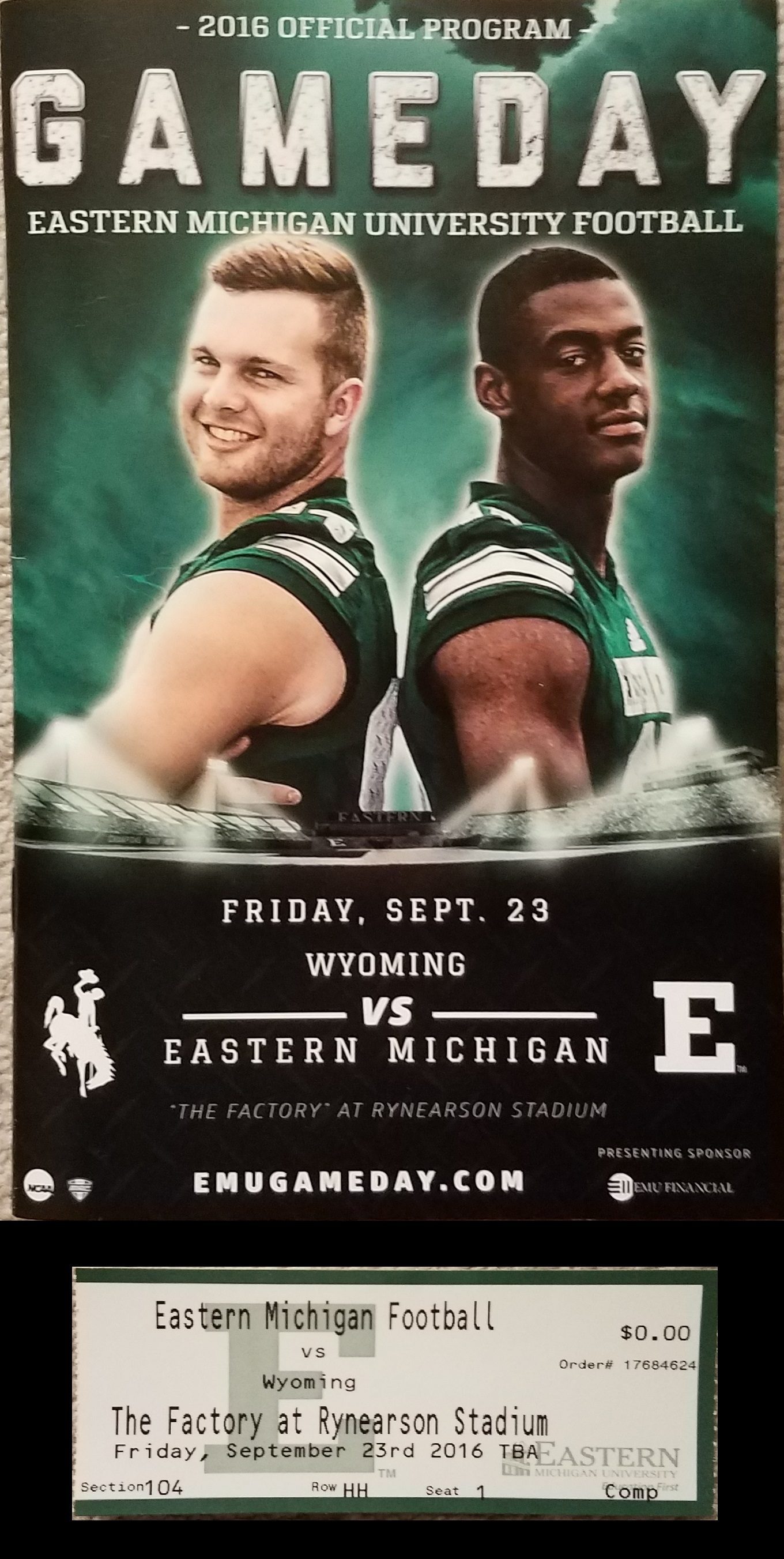 Earlier in the week, a few bad and unsettling things occurred, which led to a student demonstration during the game. About 100-200 students spend the second half gathering on the hill and eventually they reached the track. Immediately after the clock hit 0, they came on to the field to demonstrate, which pushed the teams quickly to their locker room. The disappointment of not being able to salute their team after a home win led to boos from fans sitting in the stands…..The stadium is named after Elton Rynearson, the most successful football coach at the school, especially during the 1920s and 30s…..Eastern’s only decent period of football came in the early 20th century and as mentioned before, the team has built up a lot of losses. In the 1980s, there was a 27-game losing streak and as recently as 2009, the team went winless……I was surprised at the large amount of Wyoming fans at the game. That is quite the trip and there were several hundred in attendance wearing those beautiful gold and brown colors…..For decades, Eastern Michigan’s nickname was the “Hurons”, but that changed in 1991, shortly after the state prohibited athletic nicknames derived from Native American tribes. Eastern went with “Eagles” and during football games, a live Eagle (who is unable to survive in the wild) flies in during the National Anthem and makes appearances around the stadium during the game. It’s an impressive sight both up close and afar.