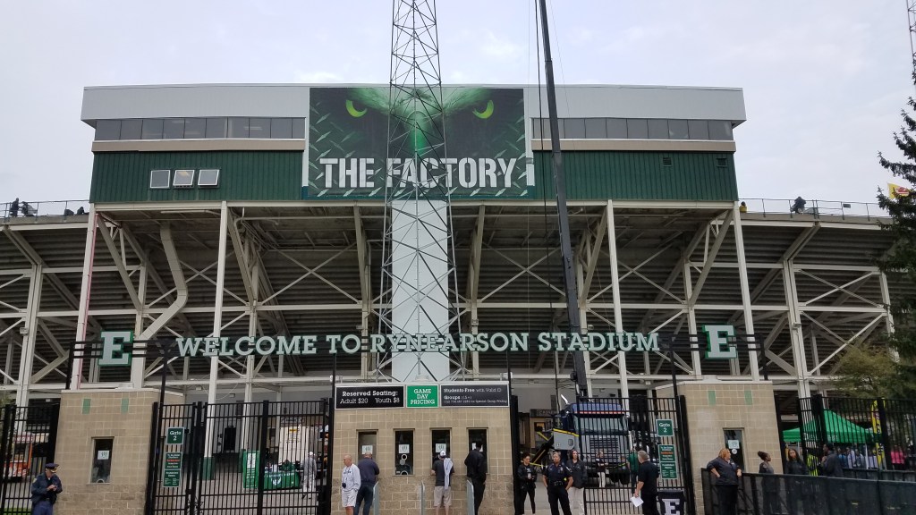 Pre-game festivities include some tailgating and a small family fun zone. Inside the stadium, The Pride of the Peninsula marching band plays the school’s fight song as they form a block E. The players come out of the field house by taking a sledgehammer to a concrete wall as the fans welcome them into The Factory. These touches give EMU a bit of personality to stand out from other schools, which I like. I wasn’t a big fan of the cannon fired after points scored for the simple question of why? Just seems like it has no meaning and is there because it’s “cool”. While the crowd was small, those that did come out proceeded to make a decent amount of noise and they really wanted to see a win. Their noise may have even forced a false start, which led to a blocked field goal that led to a lot of cheering. The game-winning touchdown brought many to their feet and this small, communal atmosphere was better than what I have seen at some other larger schools.