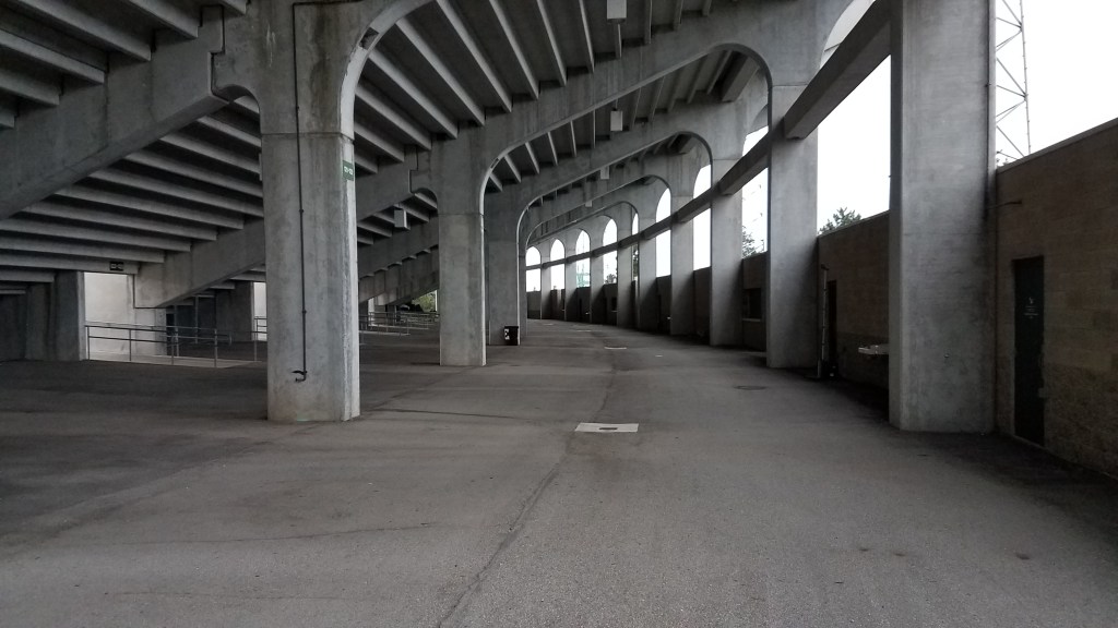 The outside of the stadium and the concourse kind of blend together as the main area with lots of space is located at ground level behind the west stands. Concessions in this area are of the standard stadium variety, except the deceptive item plainly called “Sandwich”. It’s a monster loaded with goodies and the meat choices are pulled pork, beef or chicken. There is also a nearby Bearclaw Coffee Co. truck, offering a variety of hot and cold beverages. Stairs are needed to reach the walkway behind the south end zone and this exposed space is tighter (thanks to the basketball arena as an outer frame), but the food options are better with a couple of local trucks: one offering Arbor Brewing Company beers and the other, a variety of Italian-style sandwiches and paninis. Tables and a few chairs in this area are there for those looking to hang out. Continuing on to the concourse underneath the other sideline seats (generally for fans of the visiting team), it is dark and borderline creepy with nothing but a lonely concession stand and some bathrooms. The north end zone is not accessible to fans.