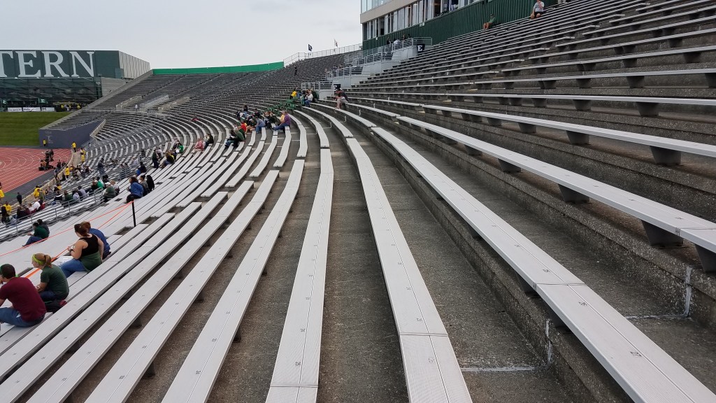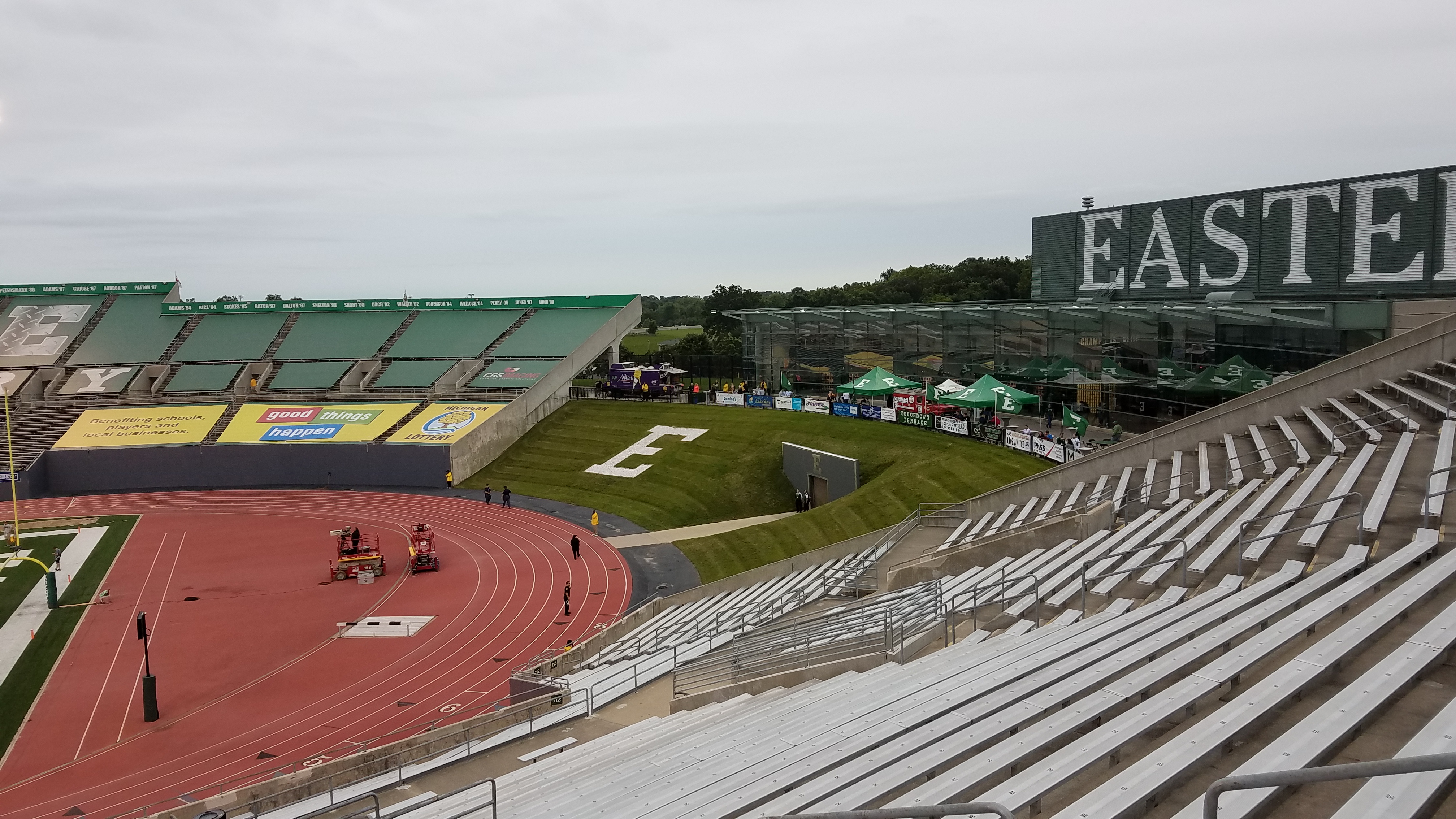 Rynearson Stadium is a simple facility in that it basically consists of two sideline stands. Each of the seating sections are made up of metal bleachers and the shape of the stands is curved, which helps point fans towards the center. The downfall however is a track surrounding the football field, which puts the seating further away. The stands continue towards each south corner as a 1992 expansion led to an attachment of additional seating that is noticeable if paying close attention. This leads to a sloped grassy section behind the end zone. At the other end is open space and the football building. Eastern Michigan has tried to stand out in both the local and national scene by dubbing their stadium “The Factory”. I like the story behind it and the visuals throughout the stadium, with one exception. The field colored gray. Some like it, but I don’t as it is such a blah, dull and weird look for a football field. The Eagles’ block E logo can be spotted in many areas throughout the stadium and I do think the design cover over unused seats on the visitor’s sideline is a great visual enhancement. A large “Eastern” is painted on the wall of the beautiful Convocation Center just behind the grassy end zone area. One other side note: below the two story press box is a section of outdoor pseudo-seats of round tables and swivel chairs in a new loge section.
