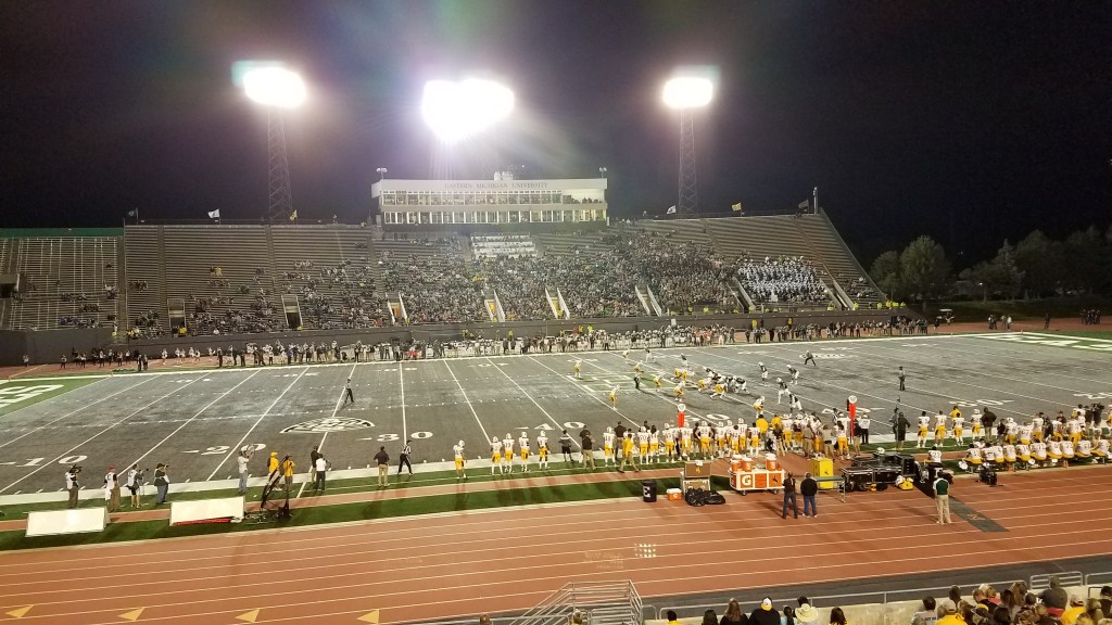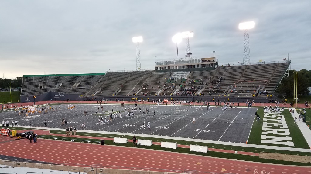 This Friday Night event brought an estimate of 6,000 to 9,000 to the game, better than a typical showing as there is often a big time struggle to fill the stands. Eastern Michigan is certainly near the bottom of the FBS in terms of fan support and atmosphere. I’m not sure that winning teams will bring more out given their history and that the region is dominated by nearby Michigan football.
