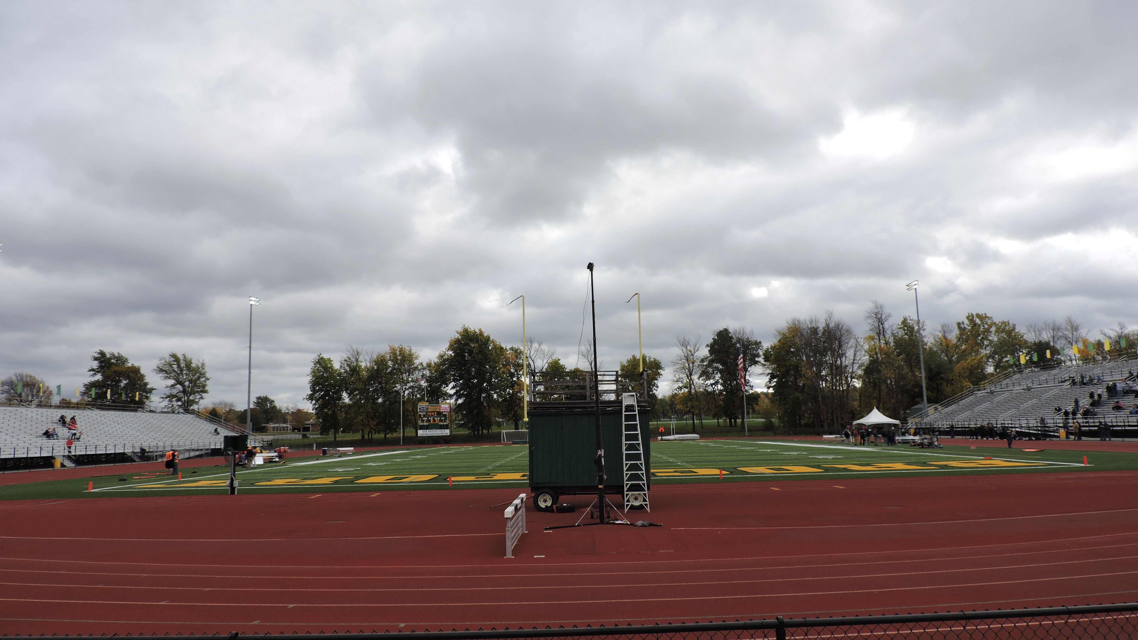 Metal bleachers make up the seating on each sideline and the bulk of the capacity is on the west/home side. These certainly resemble high school set-ups, but they can hold a lot of people and that is evident by a walkway about two-thirds up, which gives an upper/lower feel to it. A two-story press box is centered at the top and flags alternating between green and yellow fly along each side from the press box. The field of play is quite far from the stands, due not only to a track, but also a wide walkway between the track and first seats.