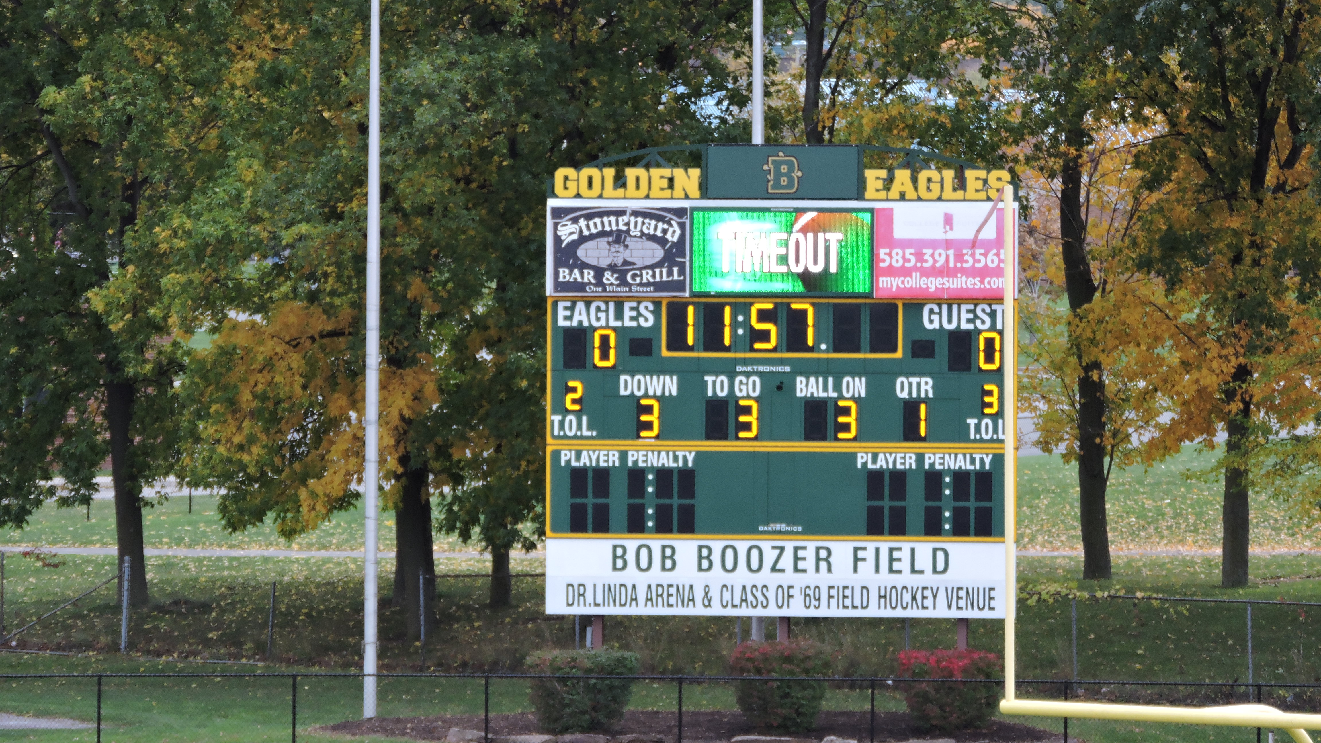In the end zone corner angled towards the home fans is an adequate scoreboard based in green. The top of the board says “Golden Eagles” with a “B” logo at the center. There are a couple of ads and in between, it took me a little while to realize that there was a digital screen. These graphics gave a little life to the board.