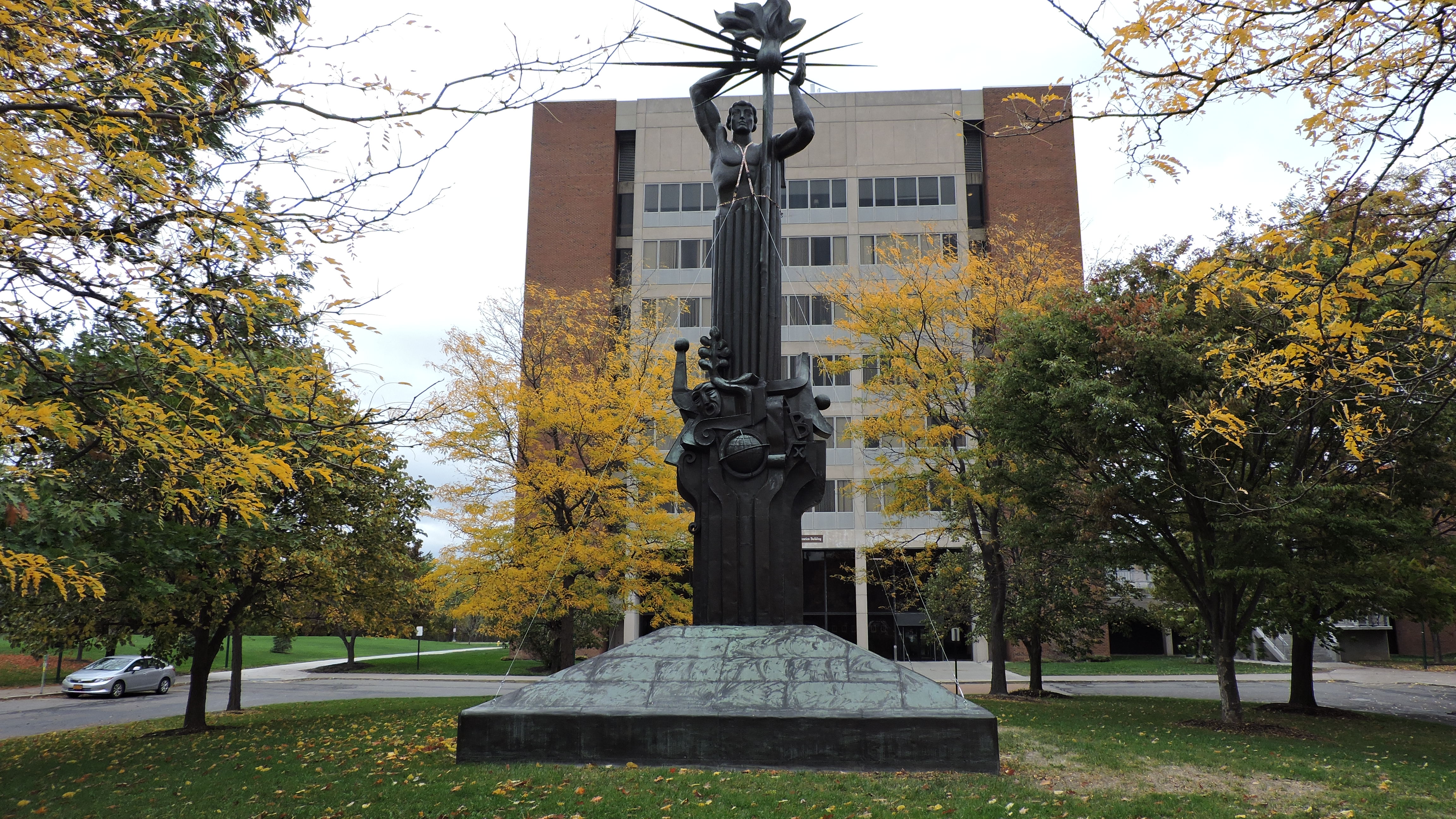 Other than a sign for the stadium behind the end zone and a trailer painted with the school’s wordmark and logo, there was nothing I would term as a display. However, it should be noted that there are two remarkable statues located outside of the stadium, not far from the parking lot. In recognition of the Special Olympics and while working on improving U.S. relations, a Soviet artist created two masterful pieces and presented them to Brockport. These towering sculptures are titled “Prometheus” and “Joy and Happiness to All the Children of the World”, the latter featuring five pillars. The pieces are impressive and it is all with a happy backdrop. Be sure to check them out.