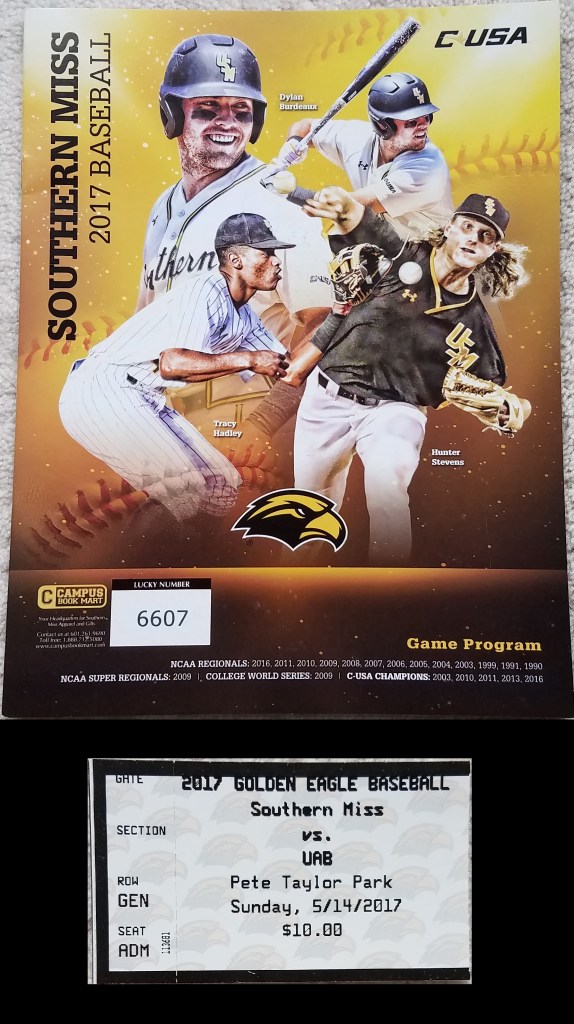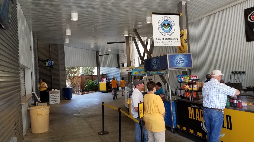 Our vacation to the Deep South started with Mississippi, where we began in the Pine Belt section of the state, specifically the city of Hattiesburg. Around 45,000 call the “Hub City” home, a nickname derived from Hattiesburg’s beginnings as a center for the lumber and railroad industries. It is also the location for the University of Southern Mississippi, a public school with a big study-abroad program. They have typically had a good baseball team and have made the NCAA Tournament 13 times, including a trip to the College World Series in 2009. In their 20+ year time with Conference USA, three titles belong to the Golden Eagles. Games are played at Pete Taylor Park, a ballpark built in 1984, but pieced together with various changes and enhancements through the years.