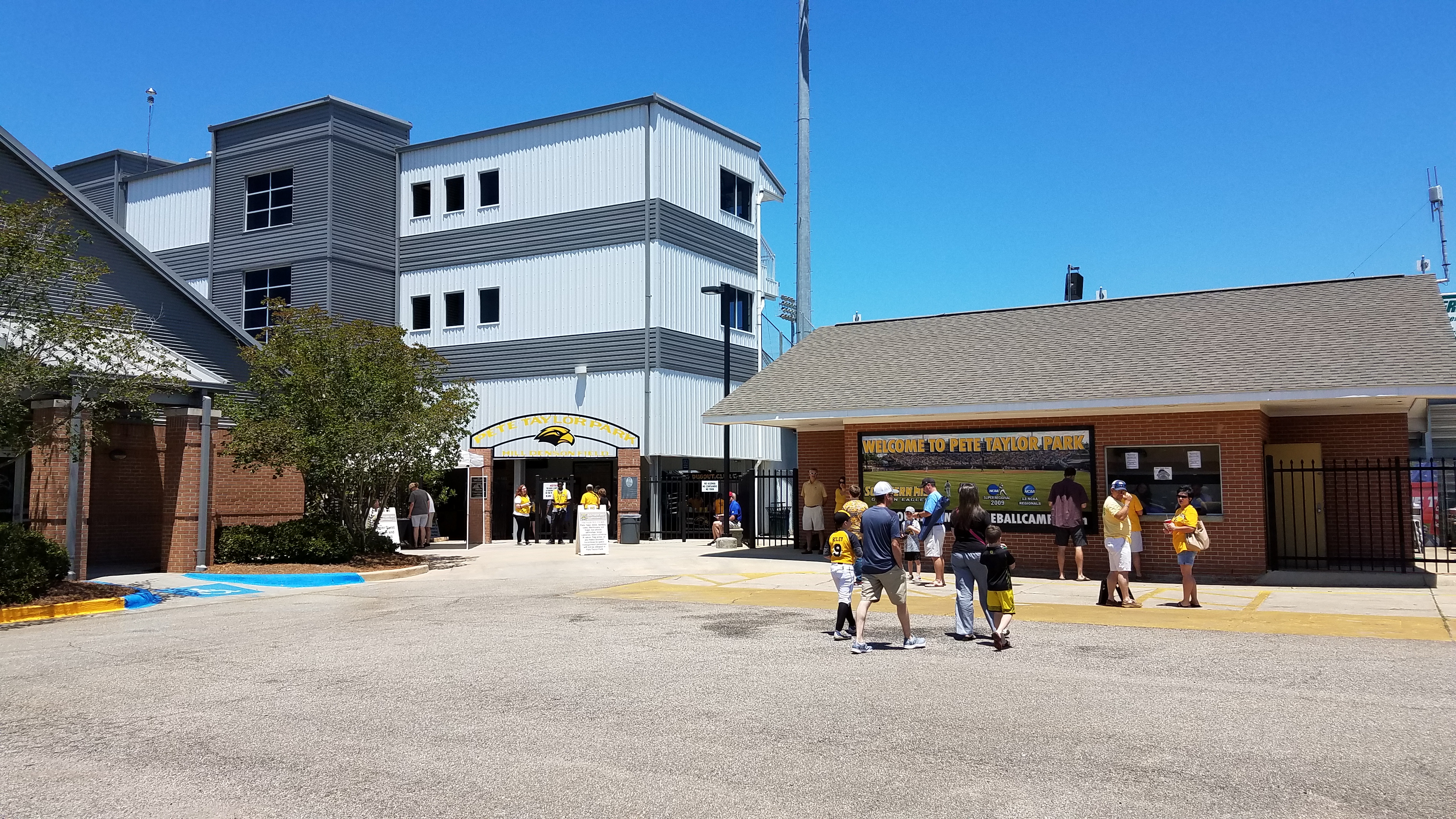 Pete Taylor Park is well away from the center of campus as it sits on the northwest fringes of the University , unappealingly sandwiched between a series of apartment complexes. It is easy to get to though as exit 65 from I-59 is nearby and there are other roads that lead into the Hub City. Parking at the ballpark is reserved, so the general public can use the spaces around the arena across the street or in the larger lot a bit further down. Easy in and easy out.